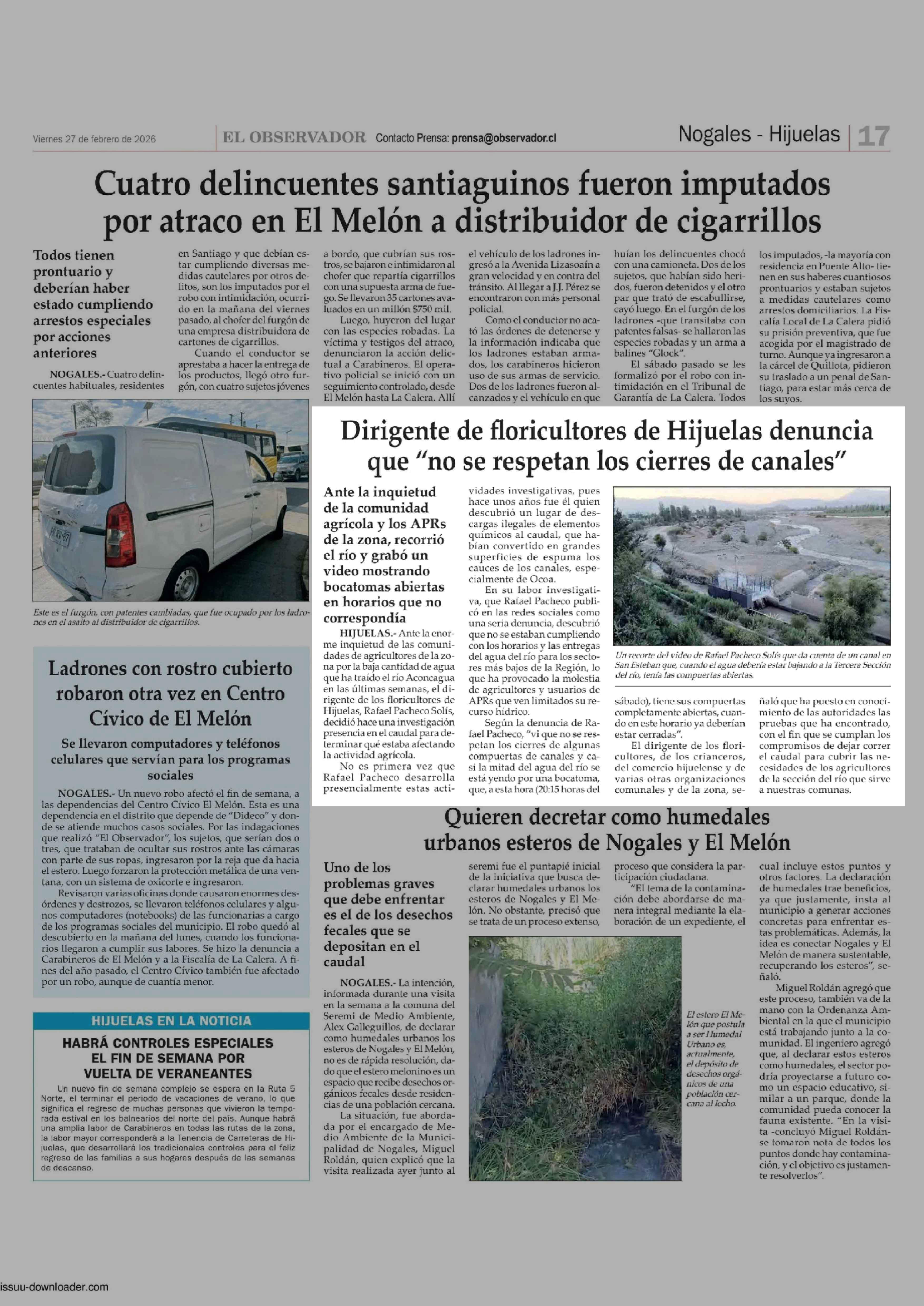Dirigente de floricultores de Hijuelas denuncia que "no se respetan los cierres de canales" 27-02-2026 El Observador |