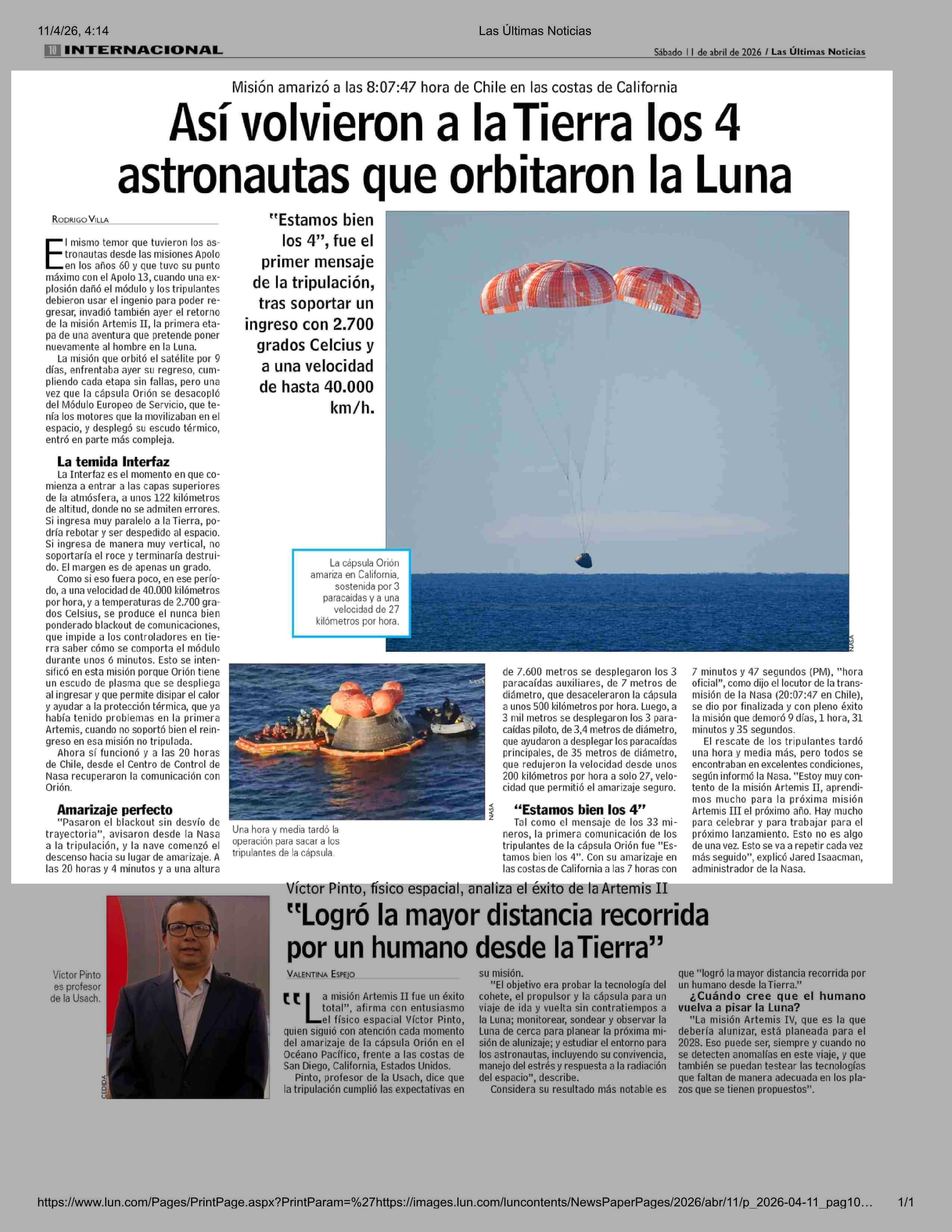 Así volvieron a laTierra los 4 astronautas que orbitaron la Luna 11-04-2026 Las Últimas Noticias |