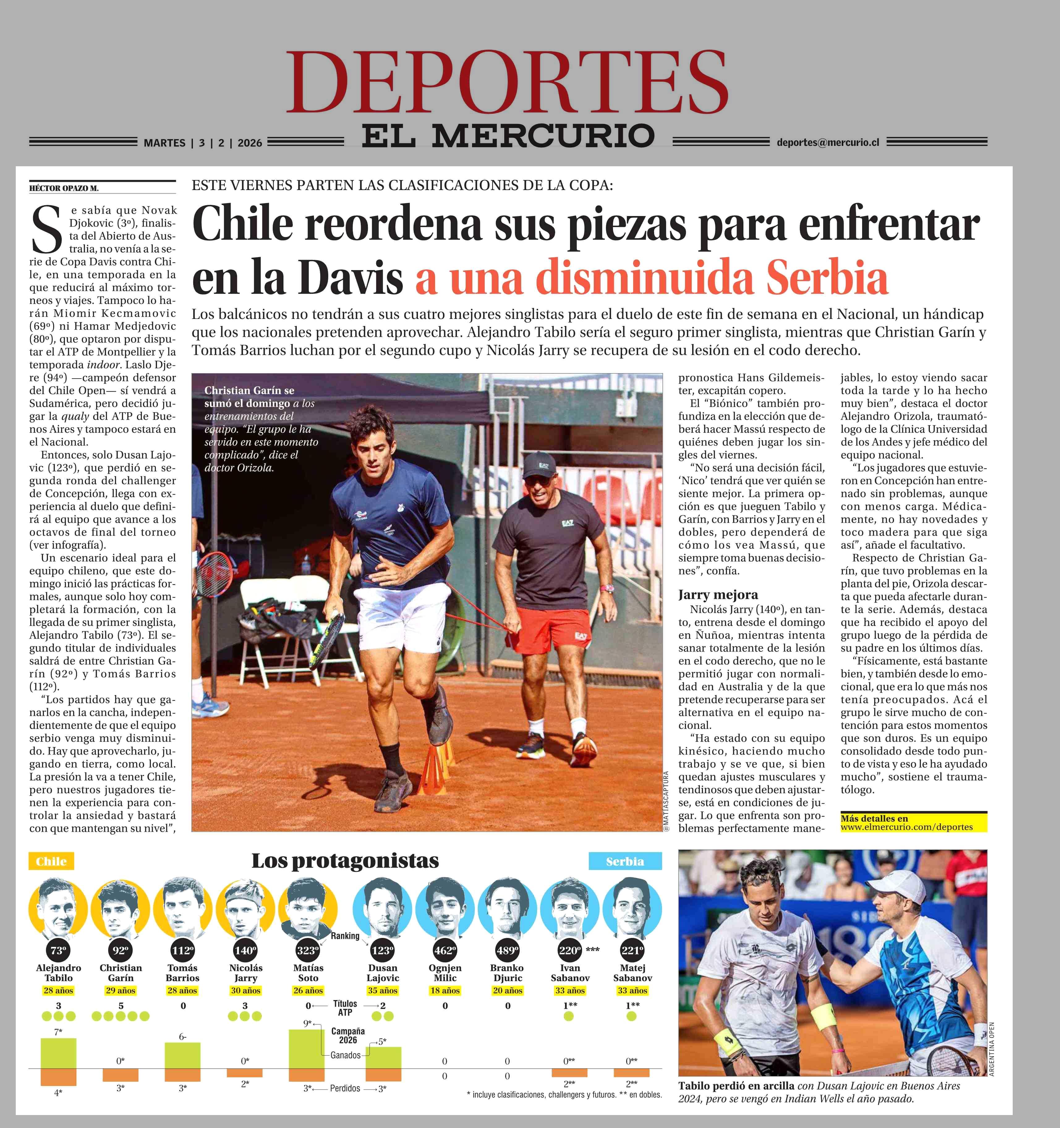 Chile reordena sus piezas para enfrentar en la Davis a una disminuida Serbia 03-02-2026 El Mercurio |