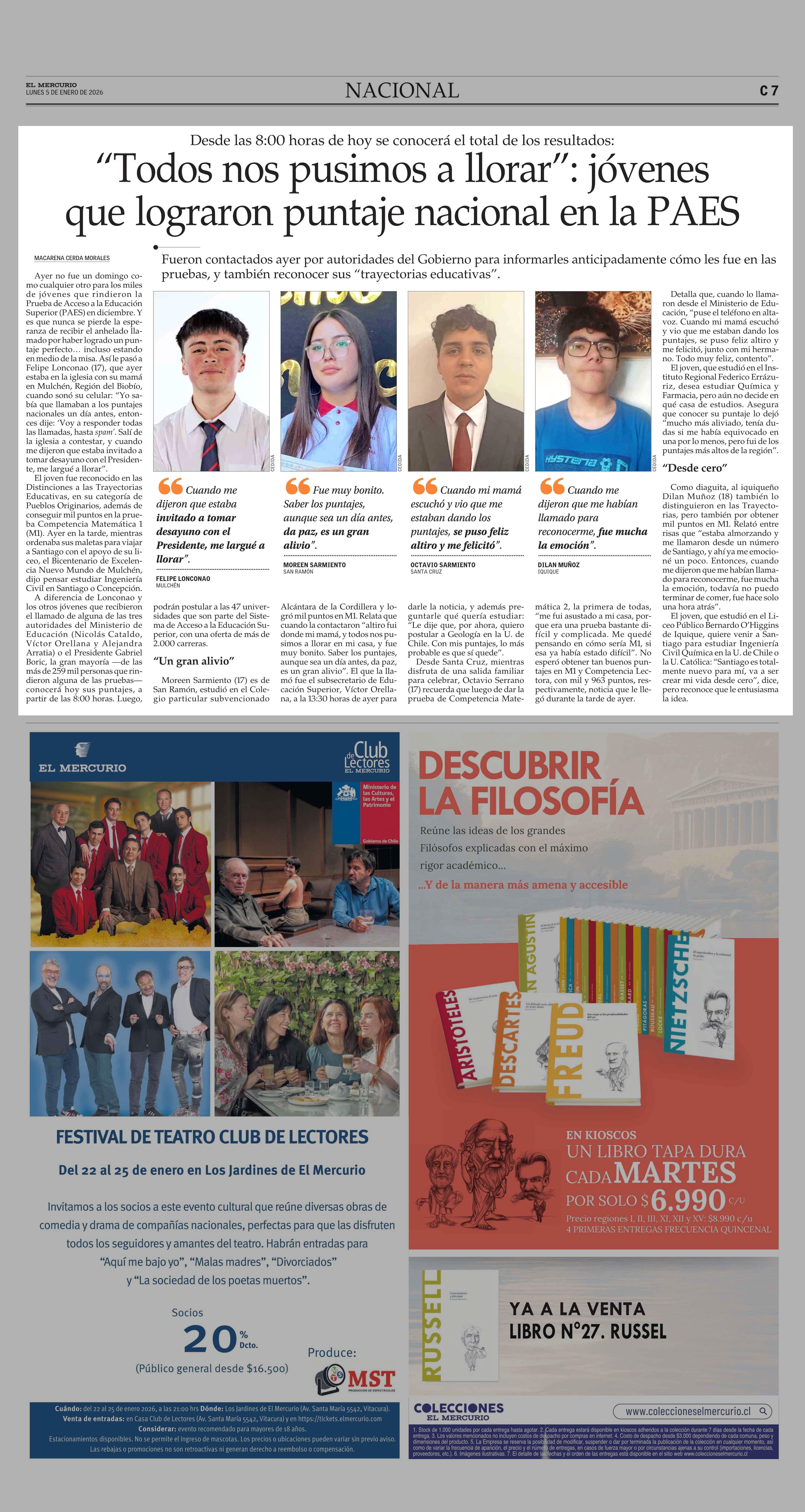 “Todos nos pusimos a llorar”: jóvenes que lograron puntaje nacional en la PAES 05-01-2026 El Mercurio |