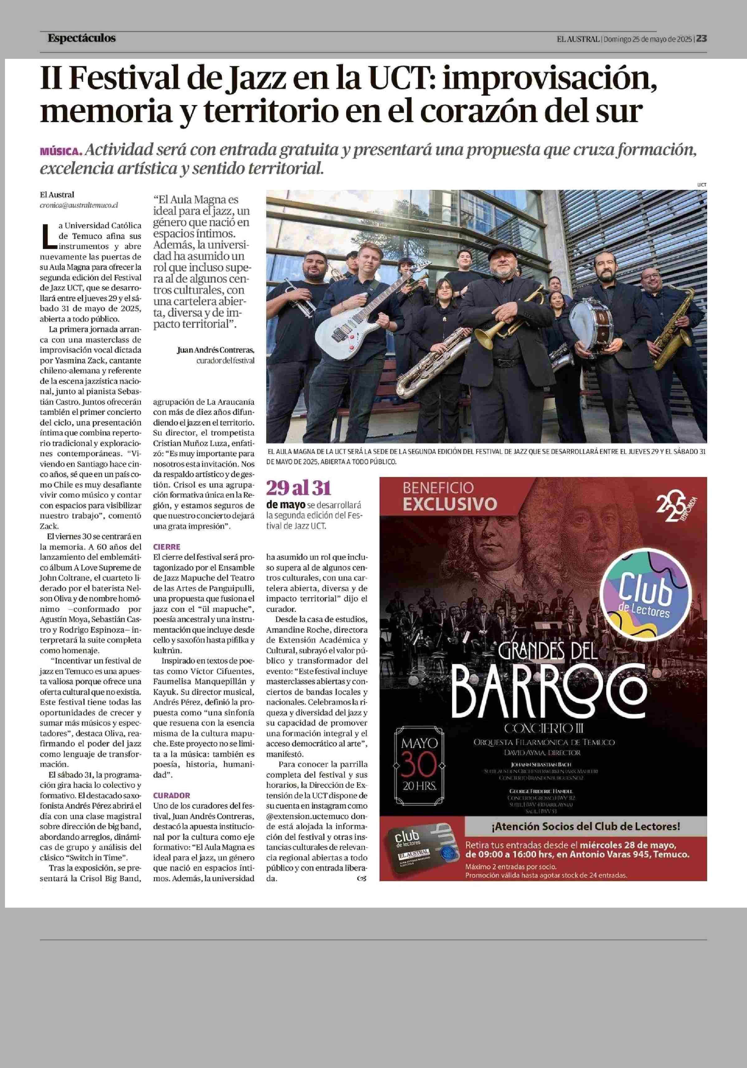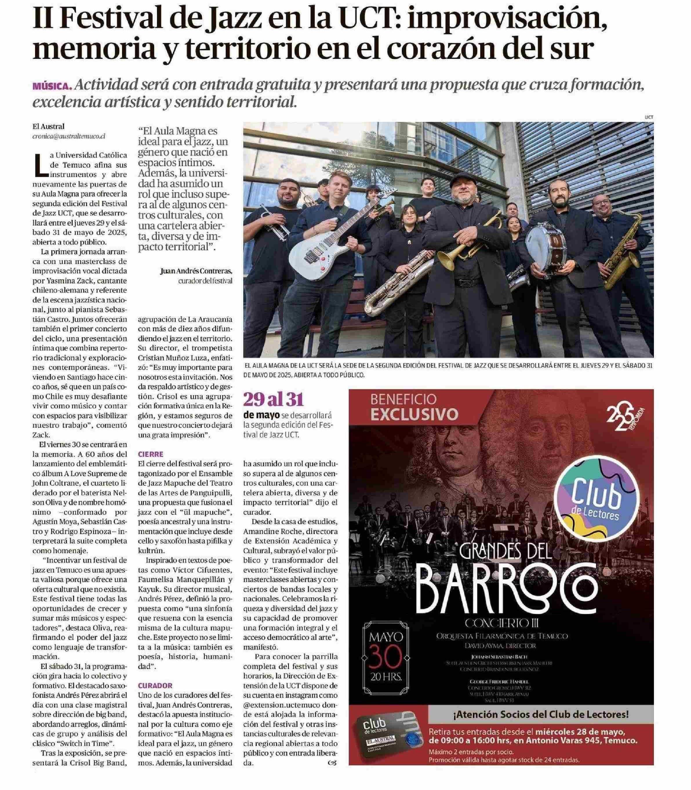 II Festival de Jazz en la UCT: improvisación, memoria y territorio en el corazón del sur 25-05-2025 El Austral de la Araucanía |