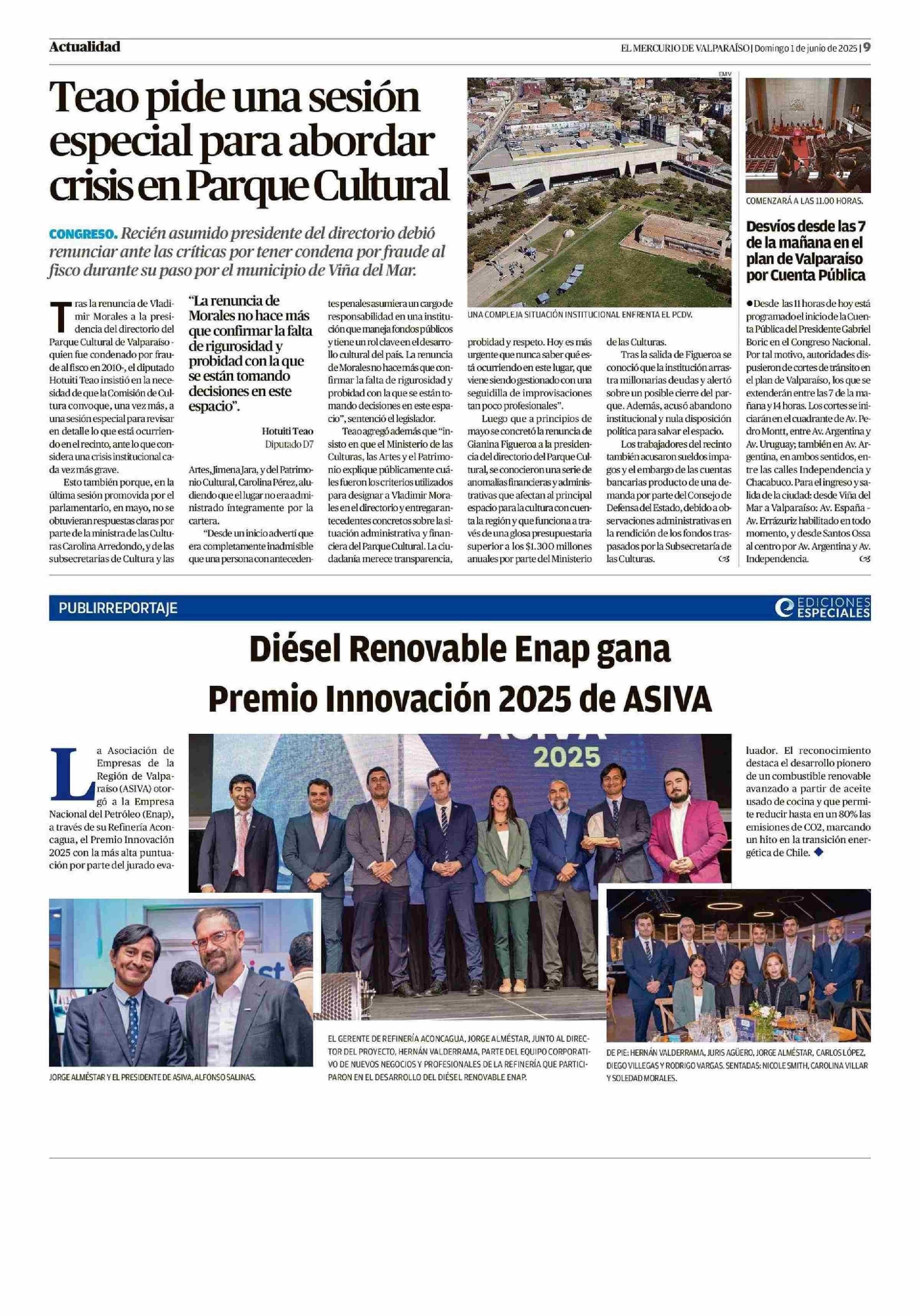 Diésel Renovable Enap gana remio Innovación 2025 de ASIVA 01-06-2025 El Mercurio de Valparaíso |