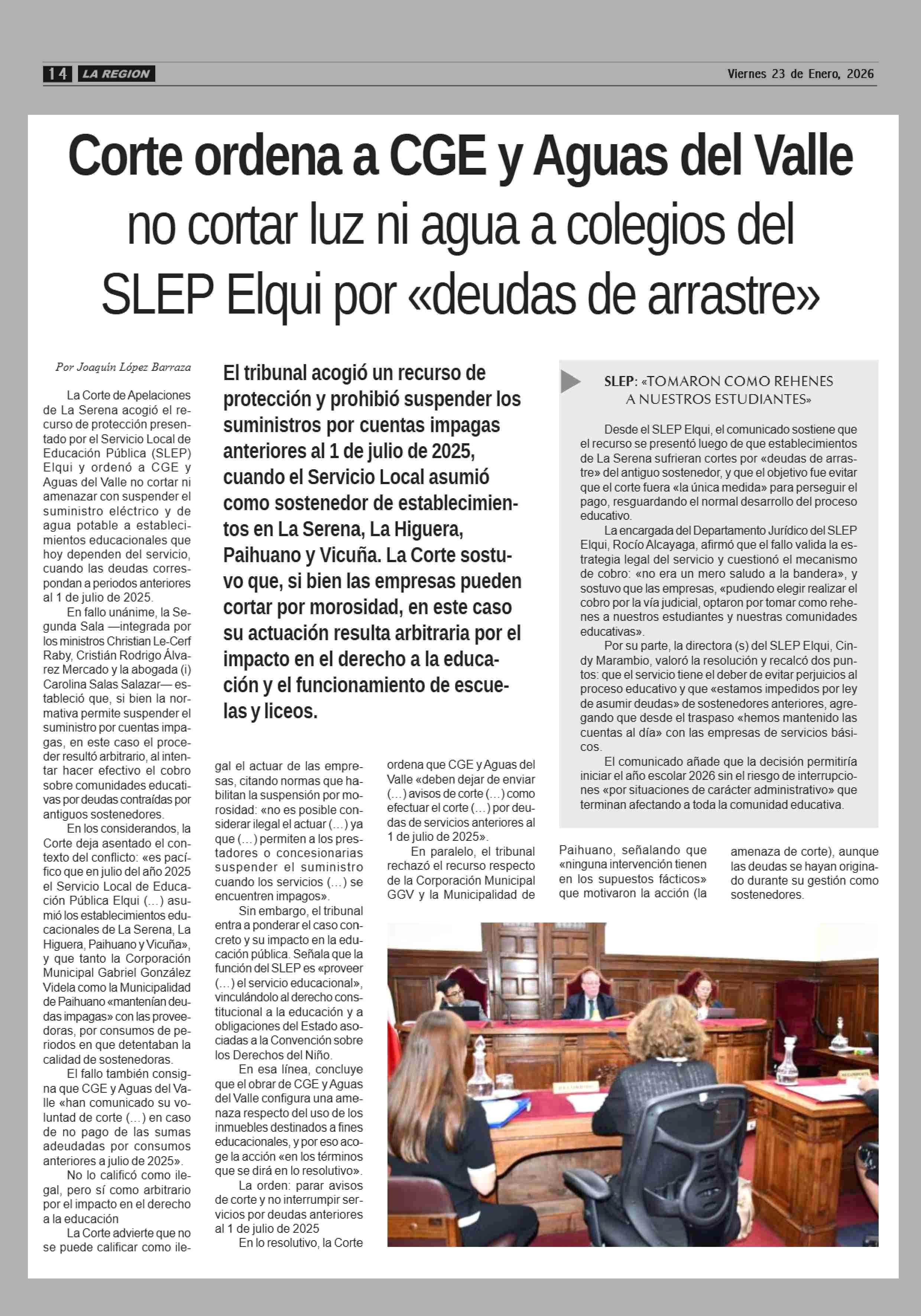 Título: Corte ordena a CGE y Aguas del Valle no cortar luz ni agua a colegios del SLEP Elqui por «deudas de arrastre»