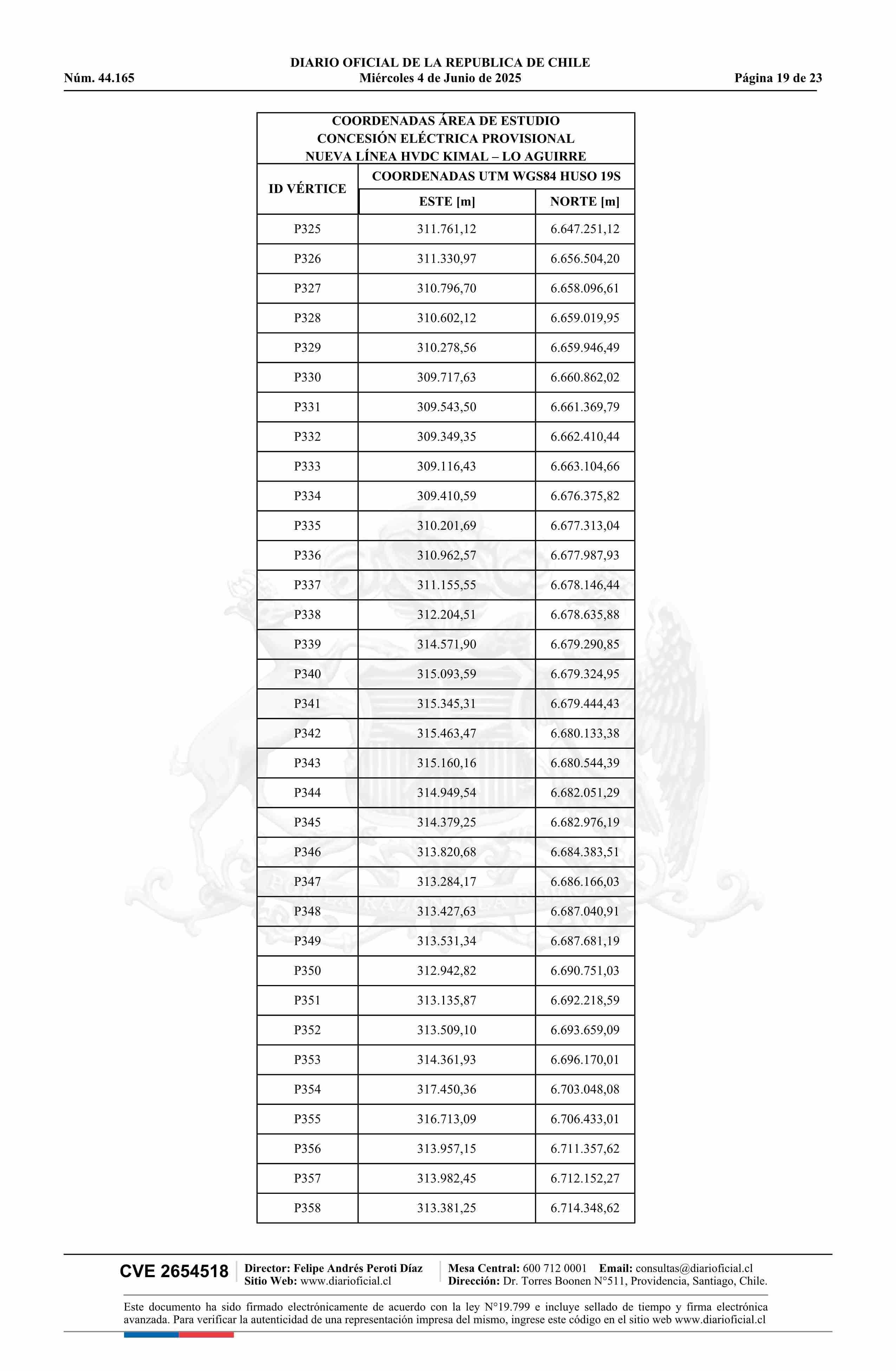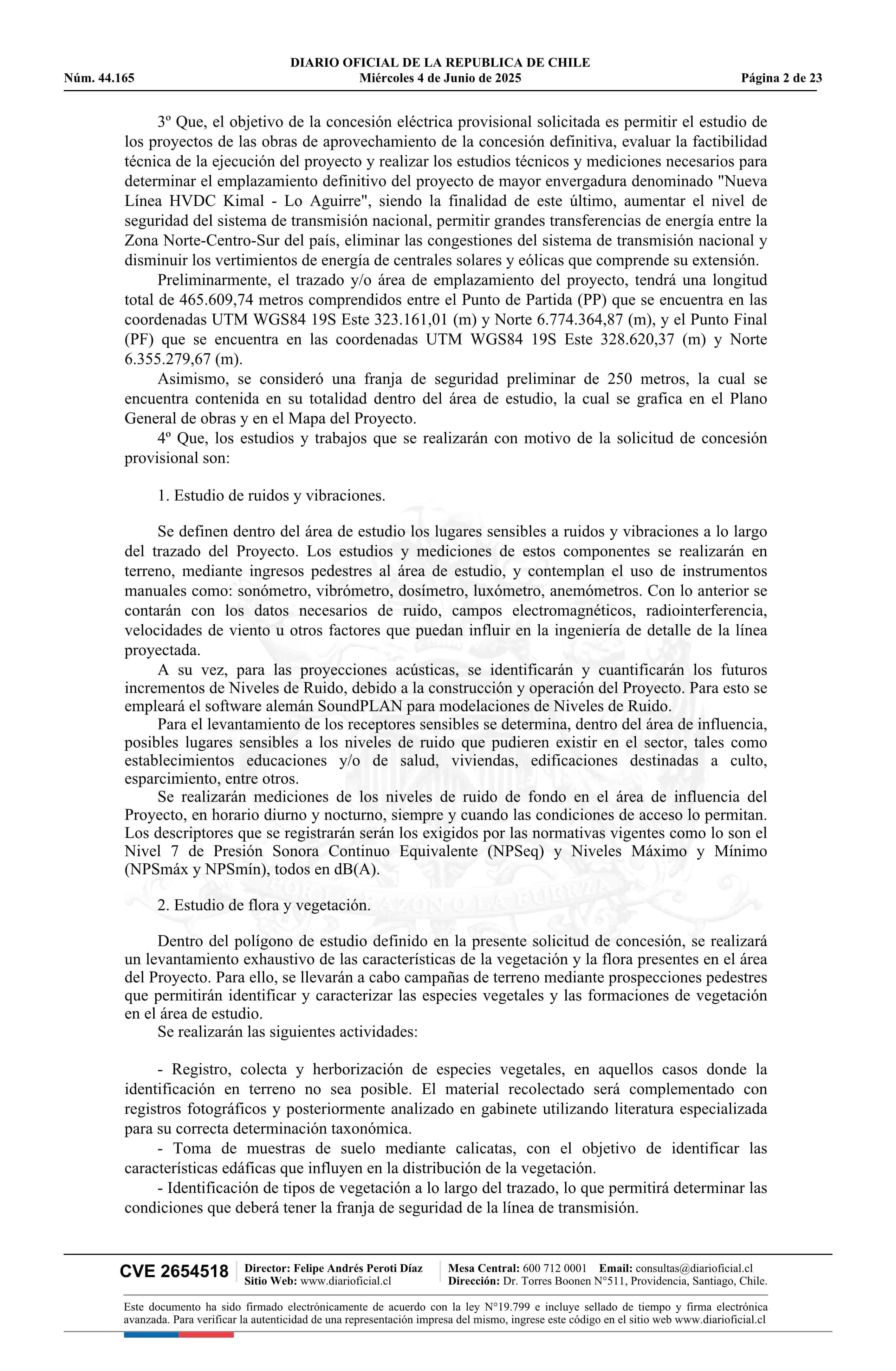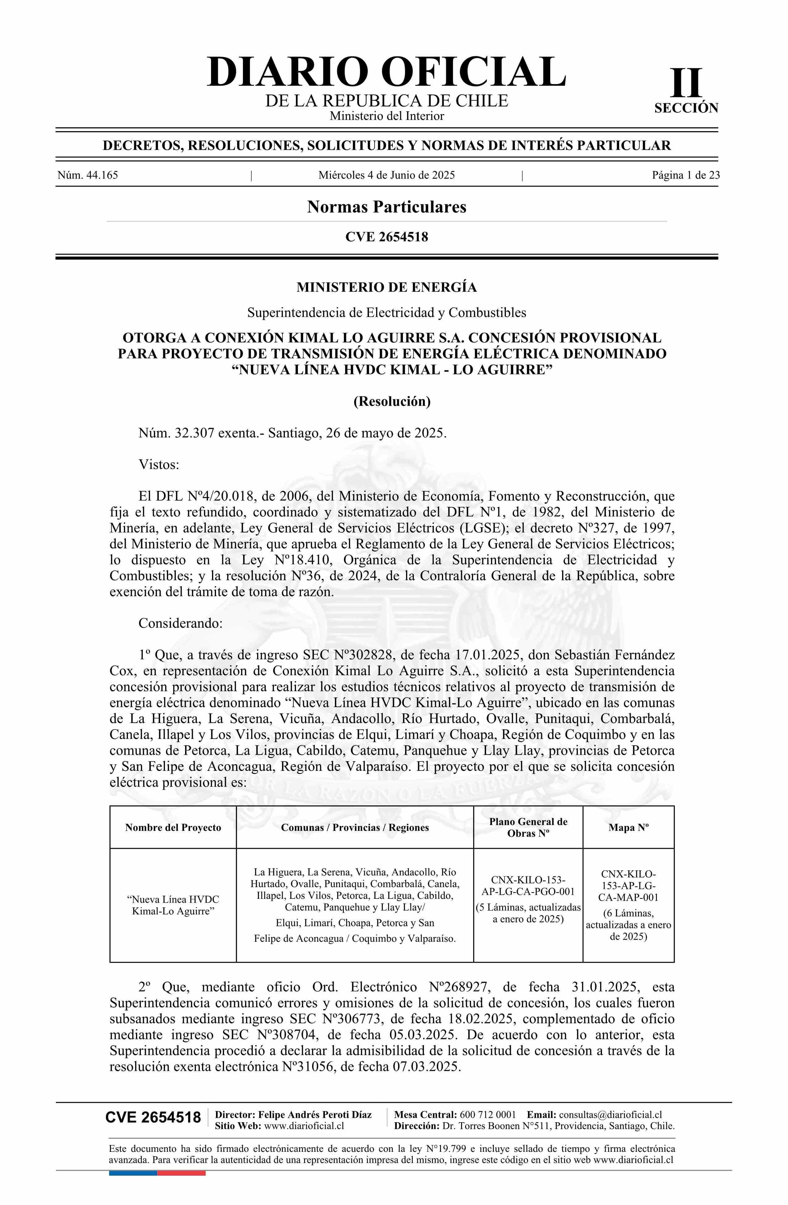 | Título: | Resolución exenta número 32.307, de 2025.- Otorga a conexión Kimal Lo Aguirre S.A. concesión provisional para Proyecto de Transmisión de Energía Eléctrica denominado Nueva Línea HVDC Kimal - Lo Aguirre |