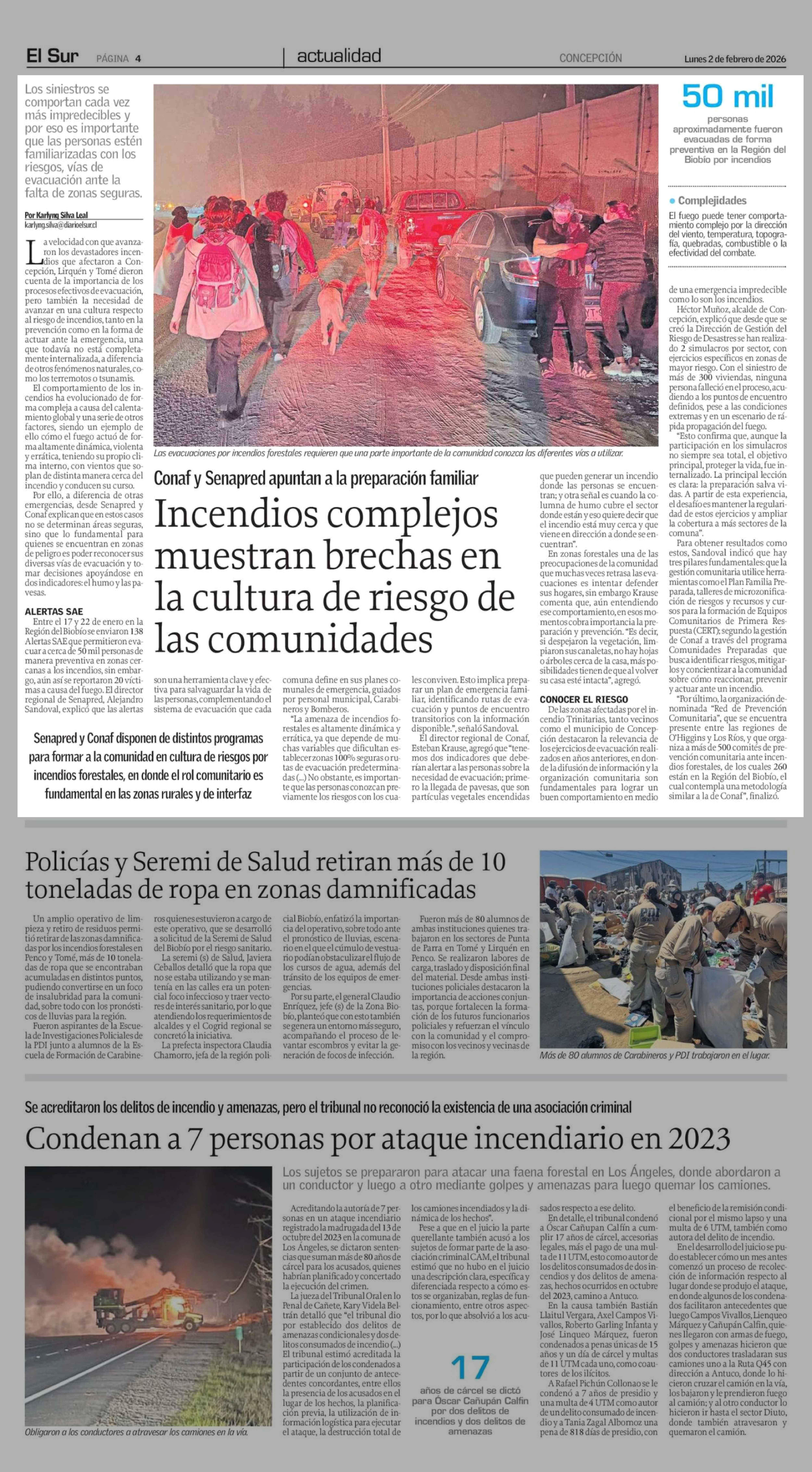 Incendios complejos muestran brechas en la cultura de riesgo de las comunidades 02-02-2026 El Sur |