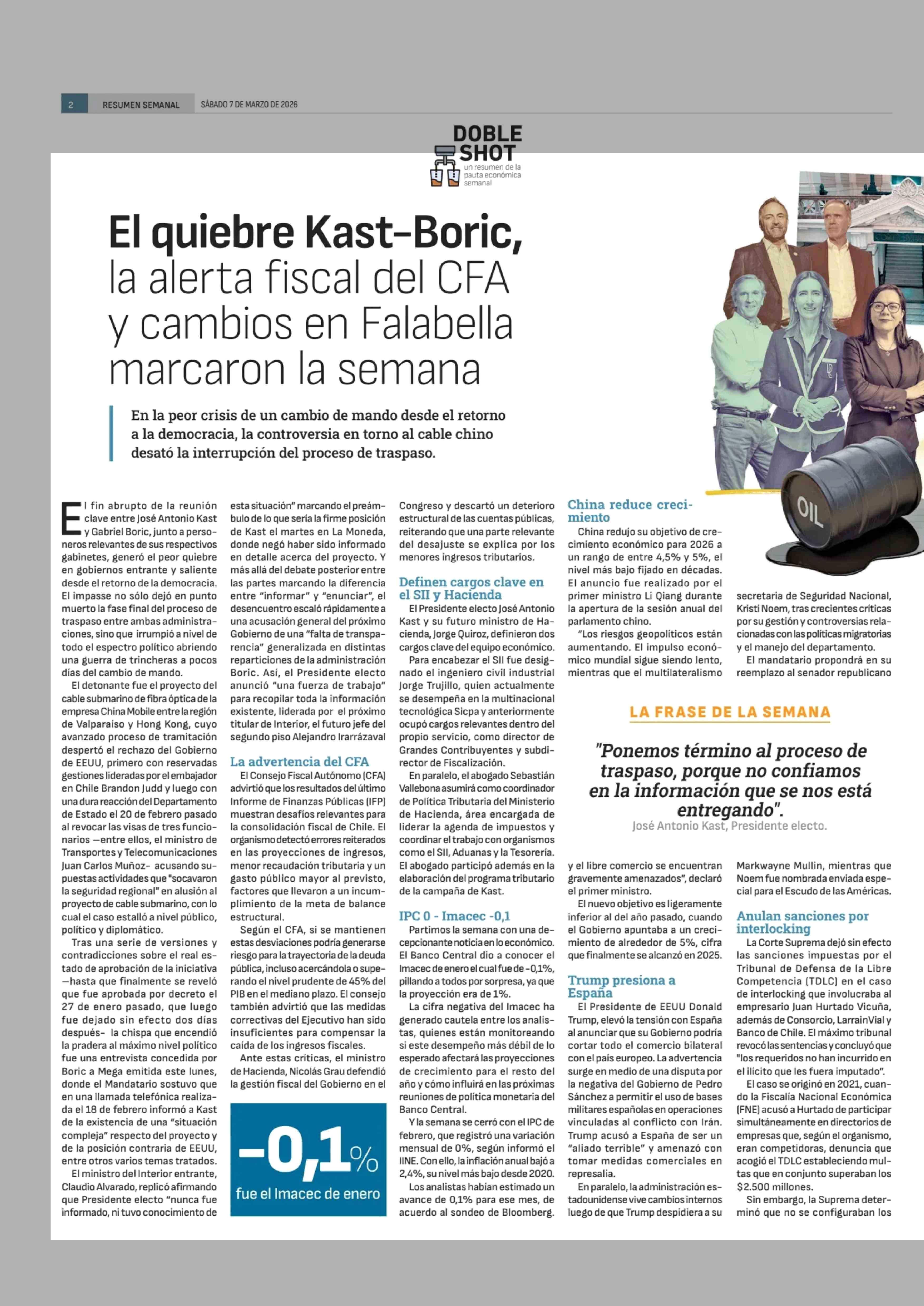 Título: El quiebre Kast-Boric, la alerta fiscal del CFA y cambios en Falabella marcaron la semana