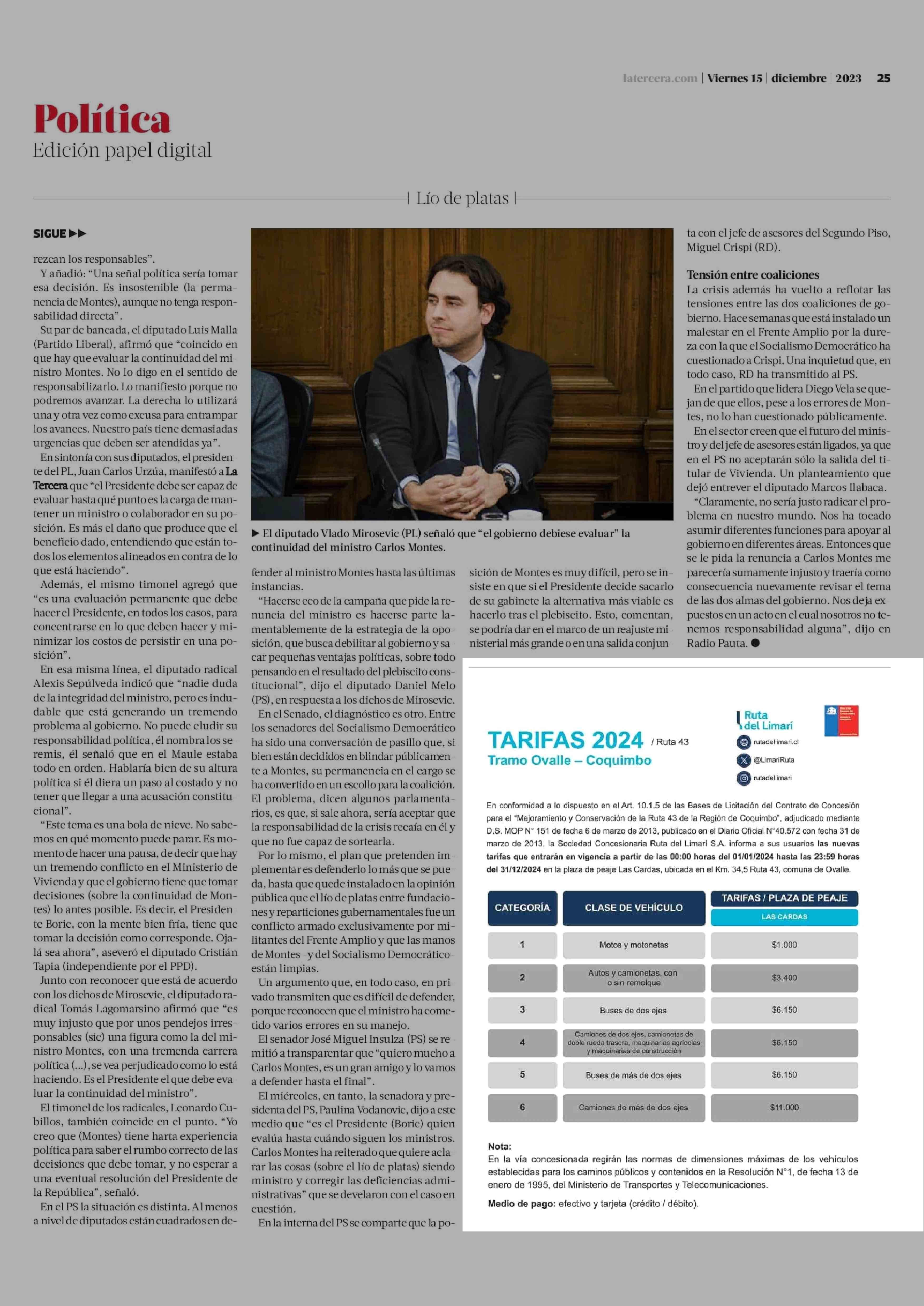 AVISO AUTOPISTAS: TARIFAS 2024 Tramo Ovalle - Coquimbo 15-12-2023 La Tercera |