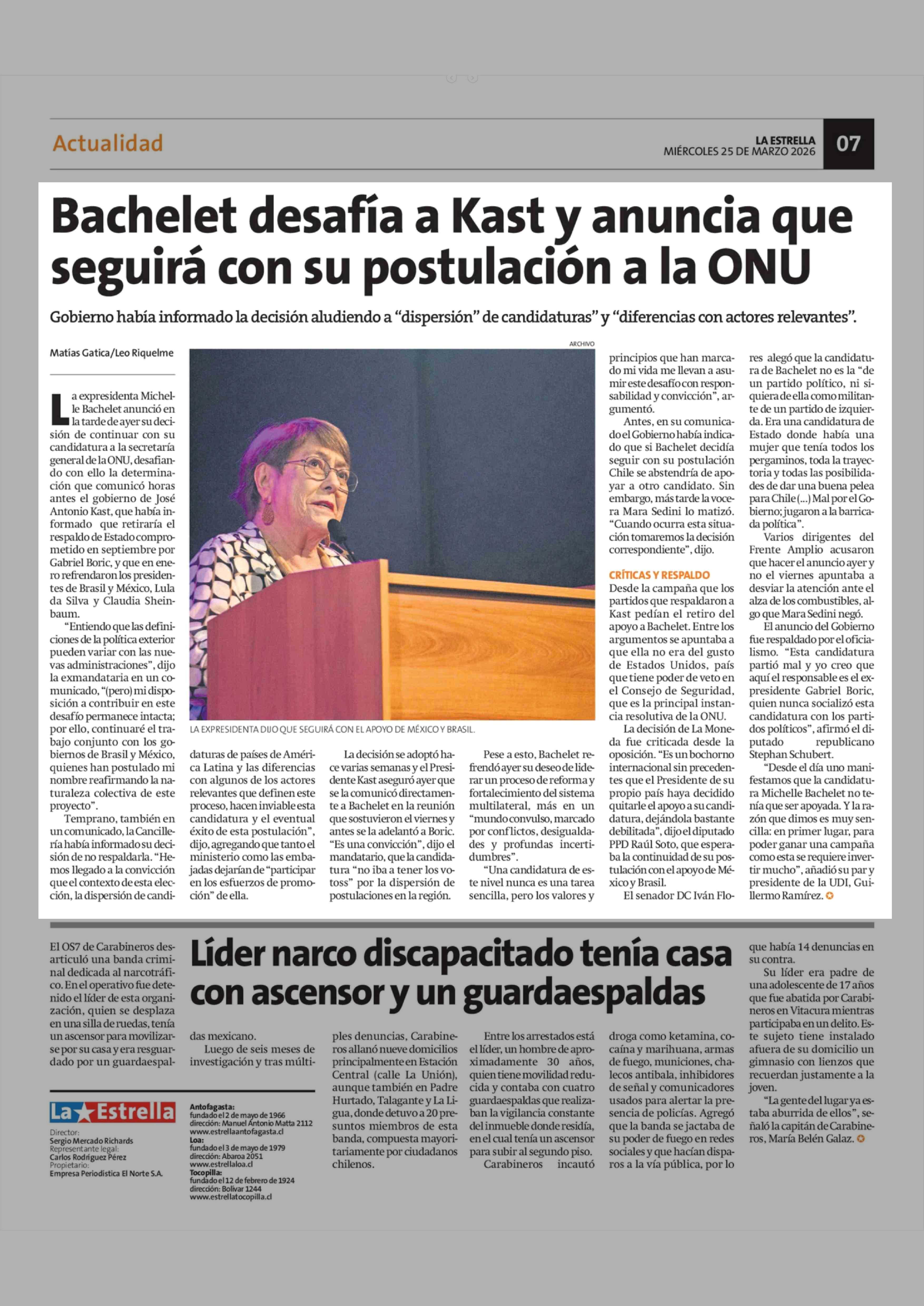 Bachelet desafía a Kast y anuncia que seguirá con su postulación a la ONU 25-03-2026 La Estrella de Antofagasta |