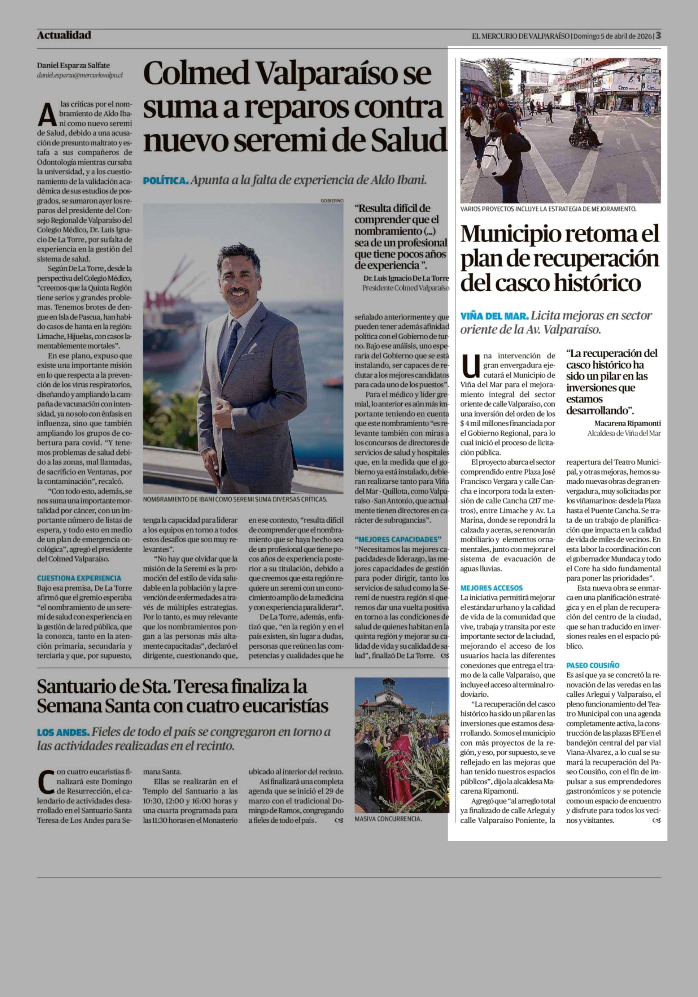 Municipio retoma el plan de recuperación del casco histórico 05-04-2026 El Mercurio de Valparaíso |