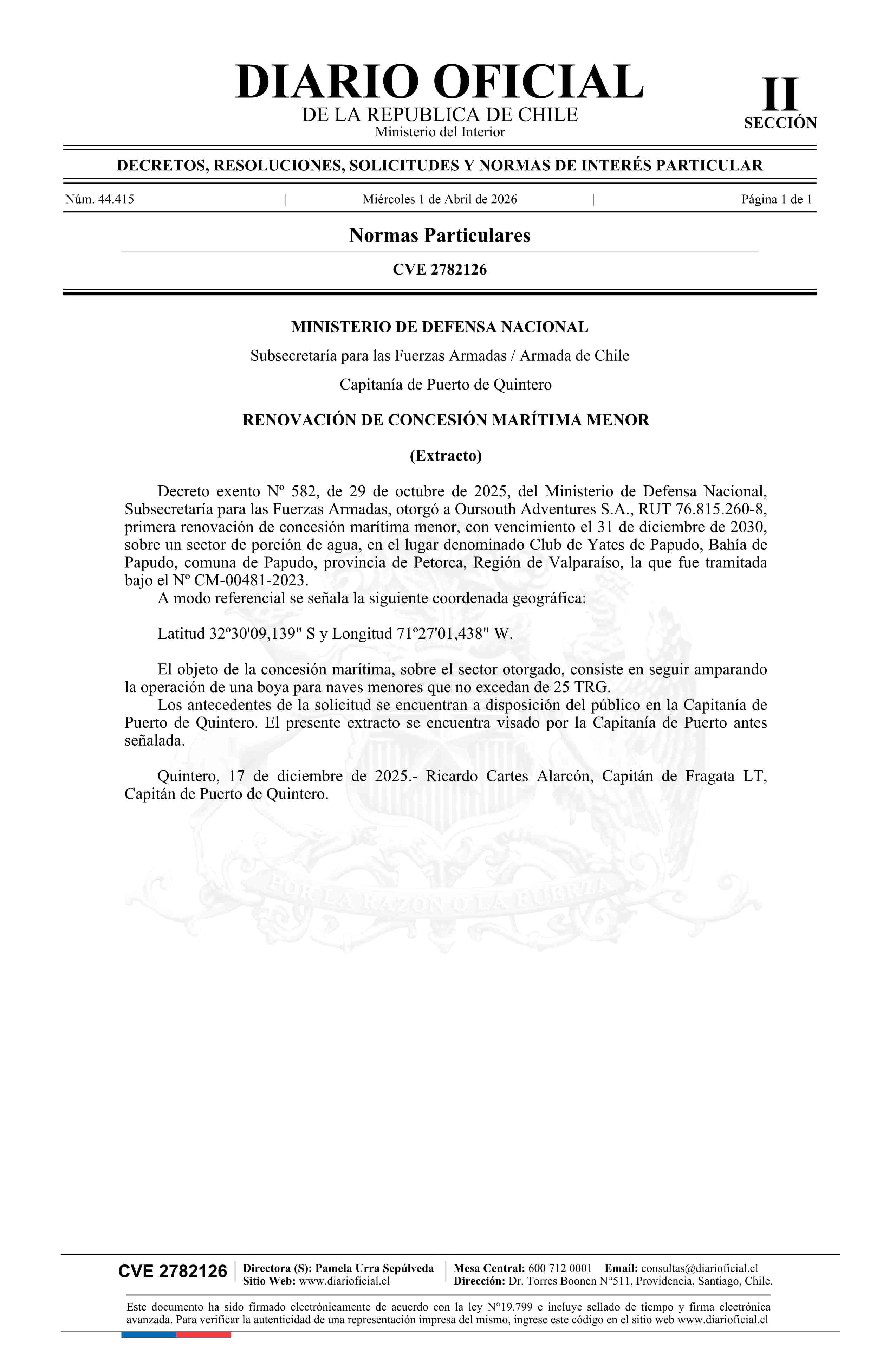 Título: Extracto de decreto exento número 582, de 2025.- Renovación de concesión marítima menor
