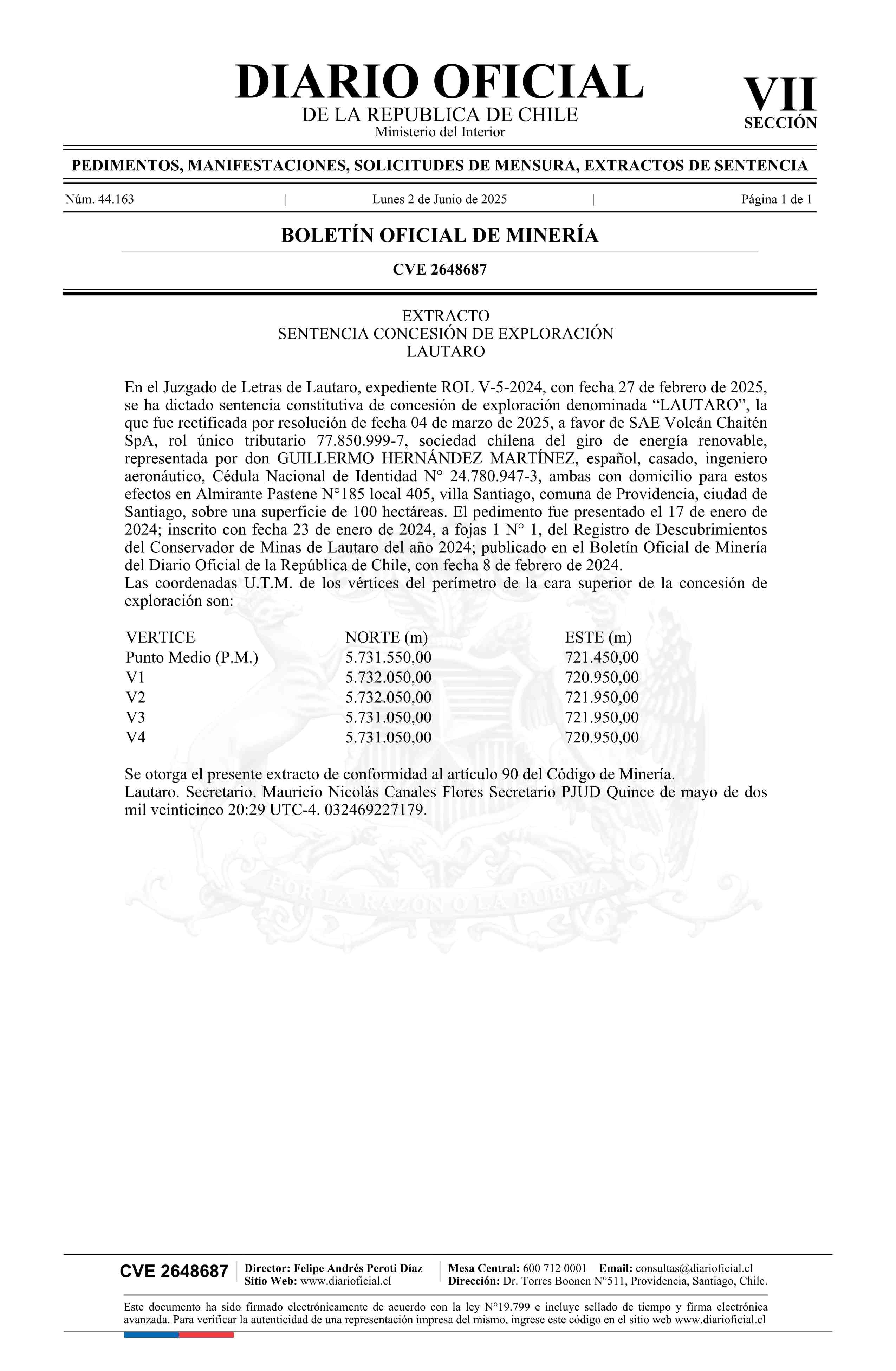 LAUTARO / SAE Volcán Chaitén SpA 02-06-2025 DIARIO OFICIAL CHILE - BOLETÍN OFICIAL DE MINERÍA |