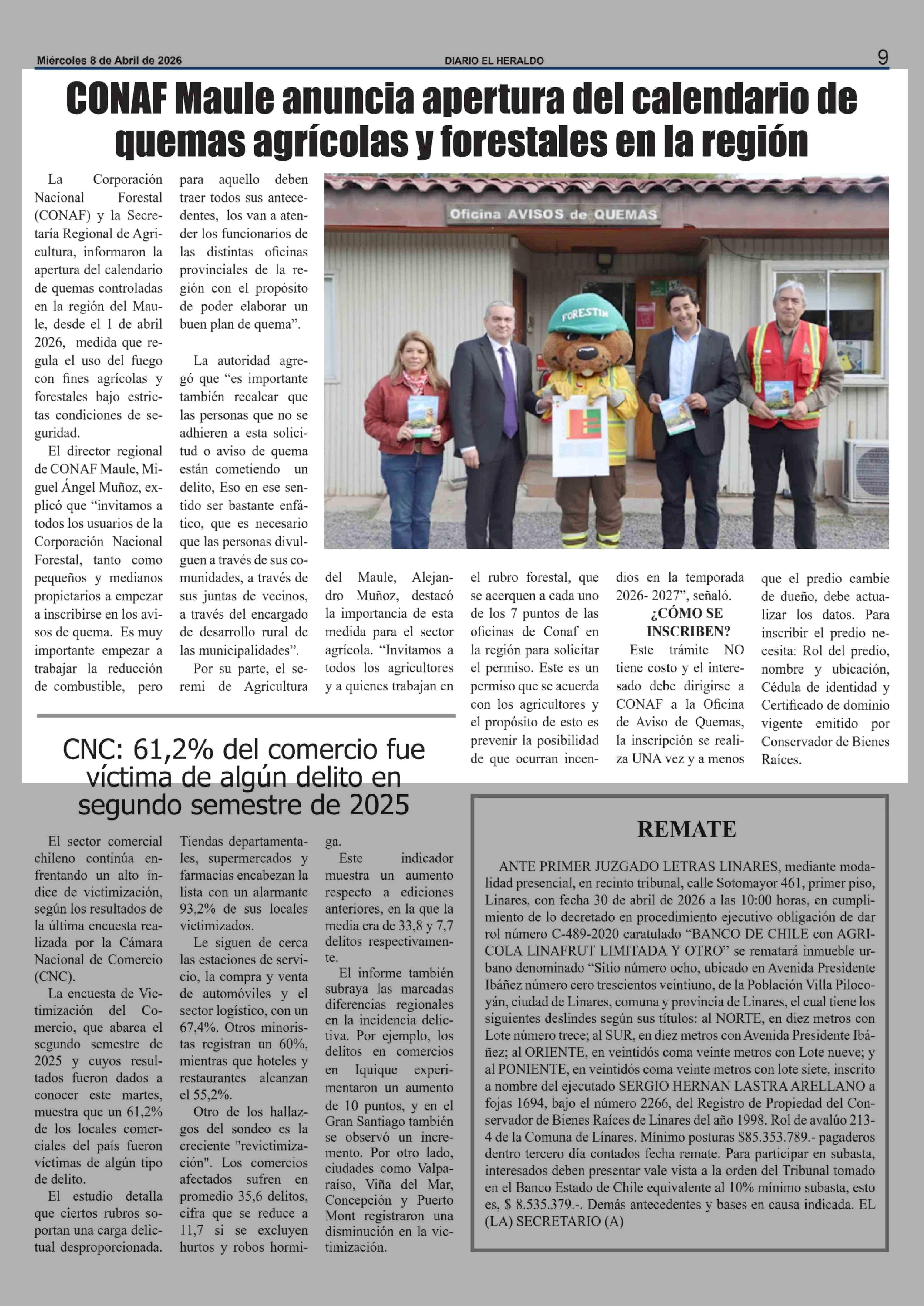 CONAF Maule anuncia apertura del calendario de quemas agrícolas y forestales en la región 08-04-2026 El Heraldo |