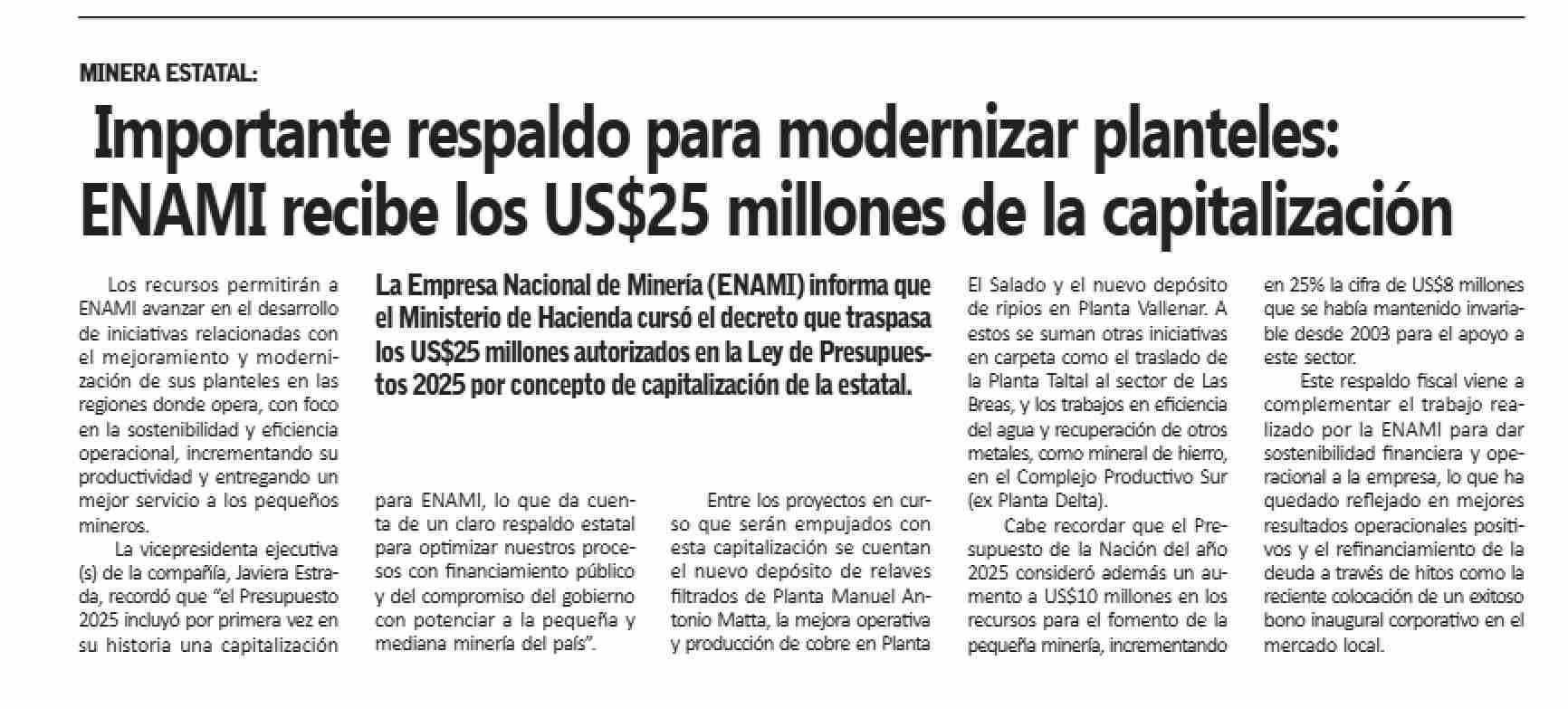 | Título: | Importante respaldo para modernizar planteles: ENAMI recibe los US$25 millones de la capitalización |