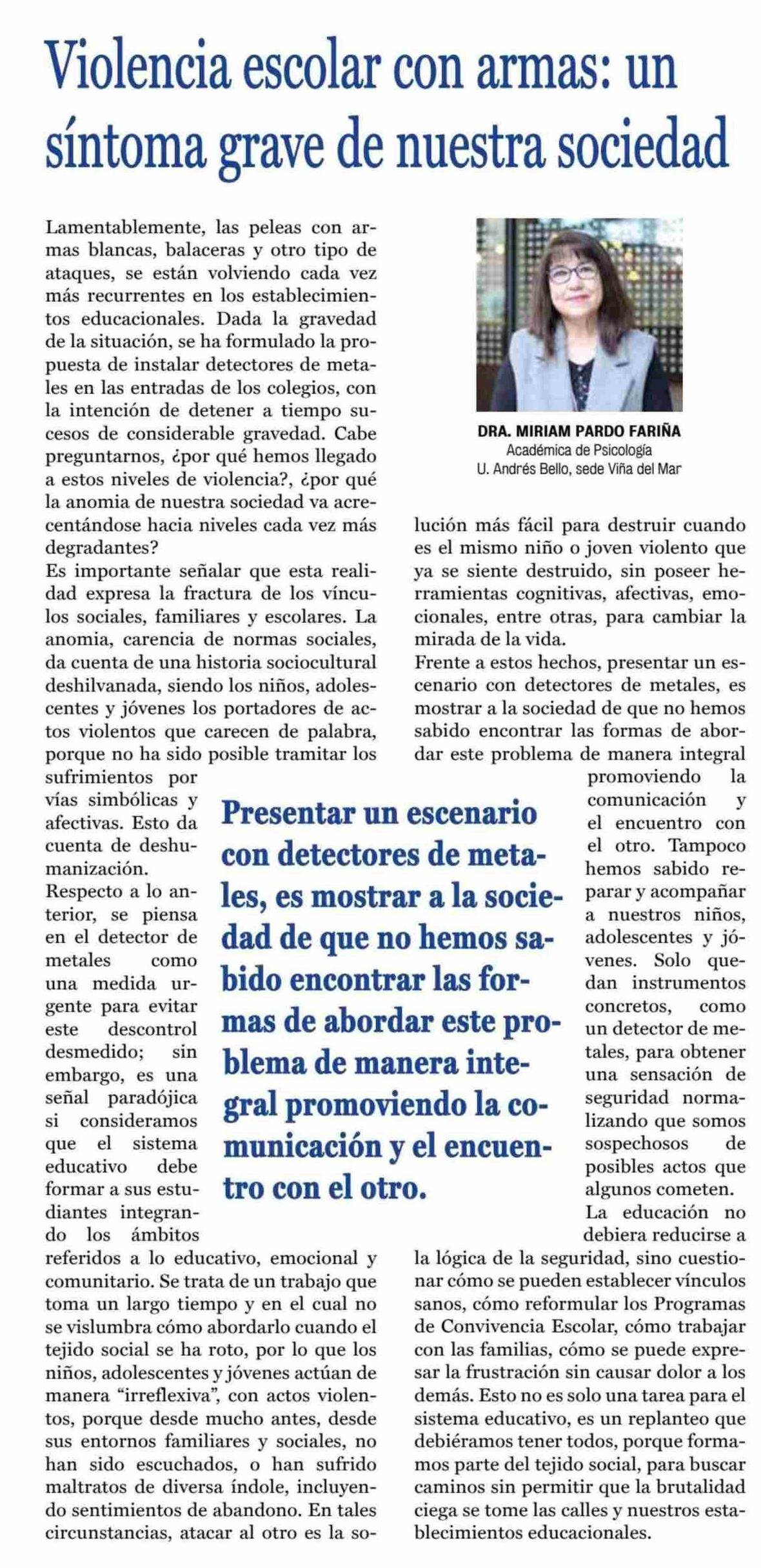 COLUMNAS DE OPINIÓN: Violencia escolar con armas: un sintoma grave de nuestra sociedad 04-06-2025 La Prensa de Curicó |