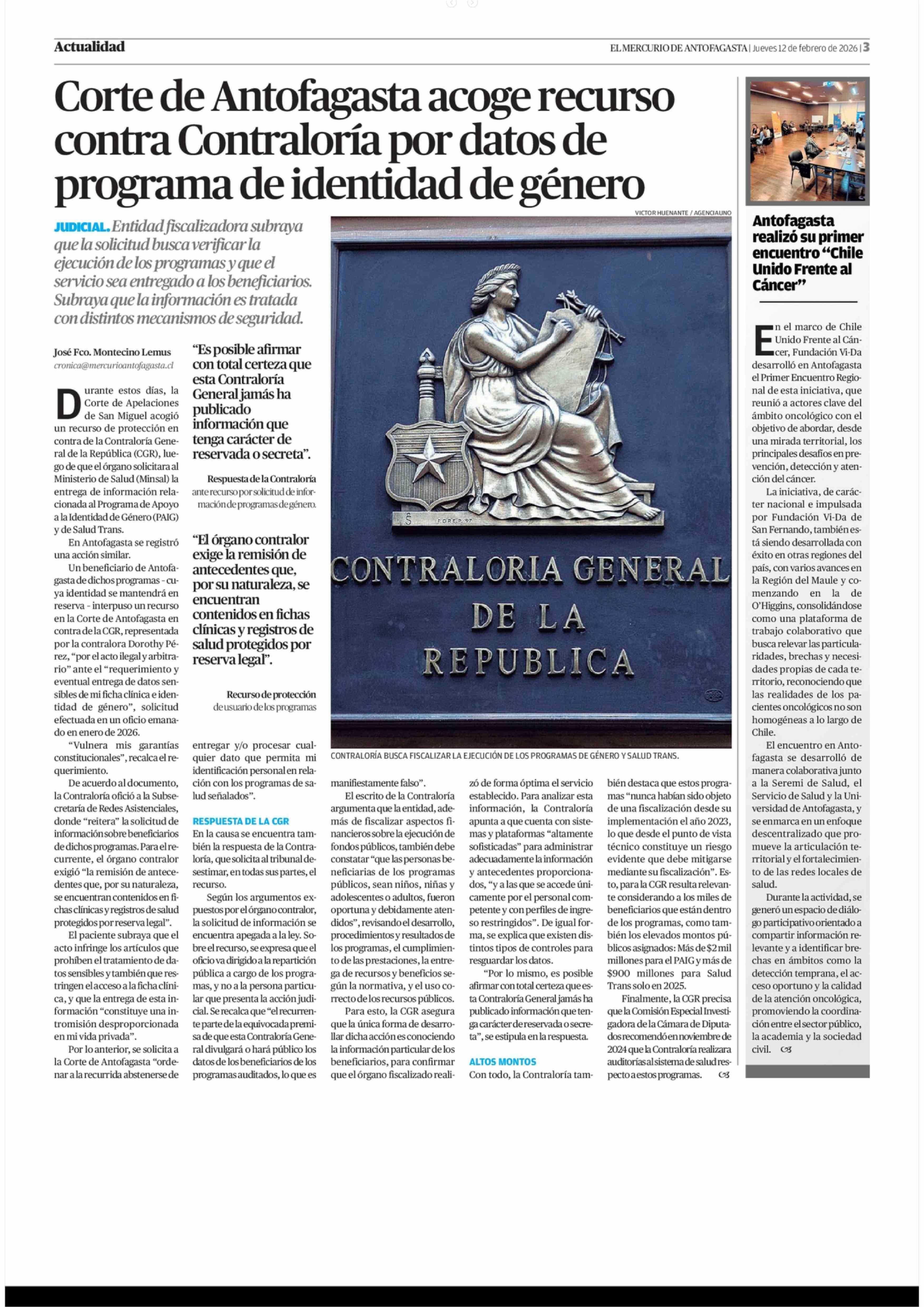 Antofagasta realizó su primer encuentro "Chile Unido Frente al Cáncer" 12-02-2026 El Mercurio de Antofagasta |