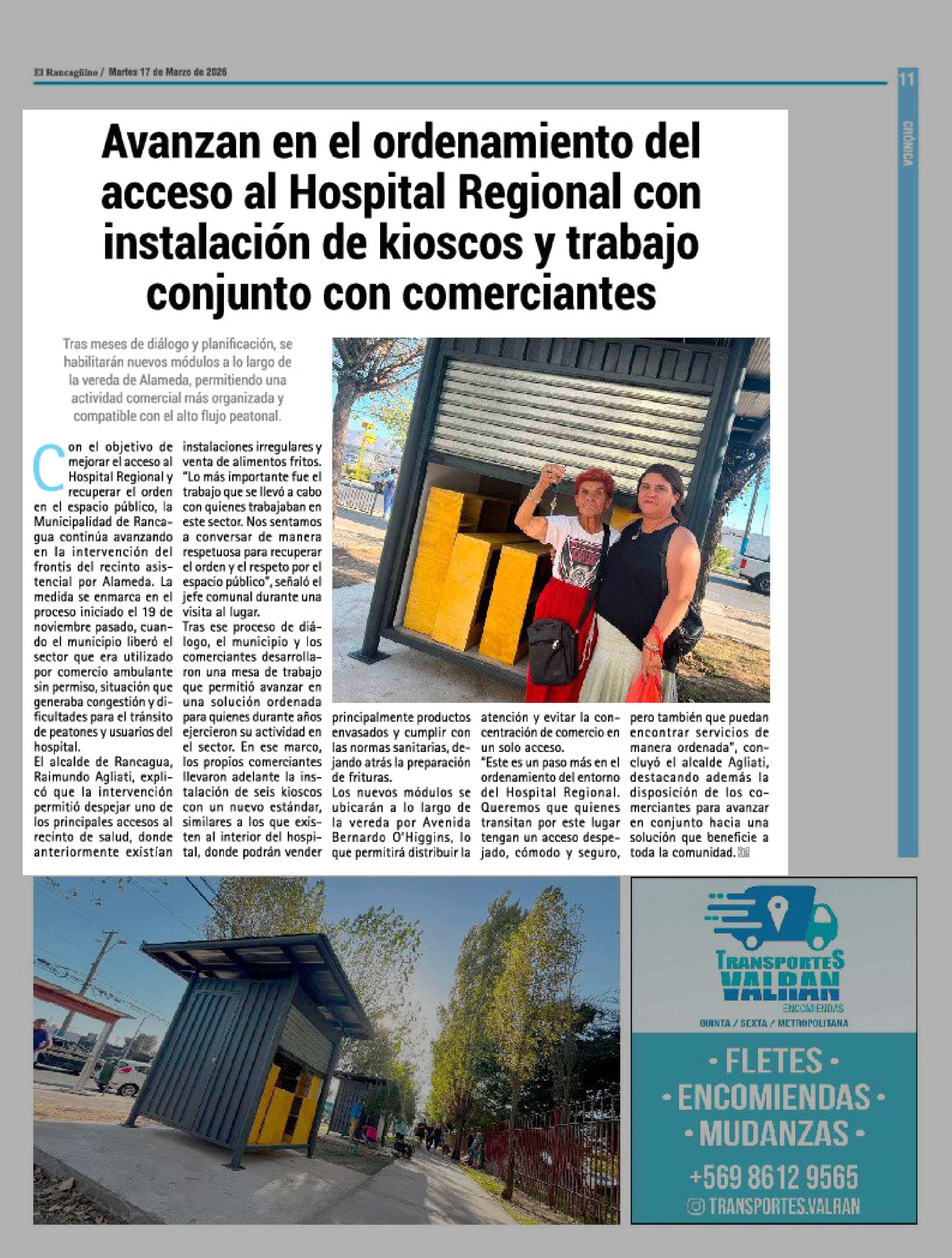 Avanzan en el ordenamiento del acceso al Hospital Regional con instalación de kioscos y trabajo conjunto con comerciantes 17-03-2026 El Rancagüino |