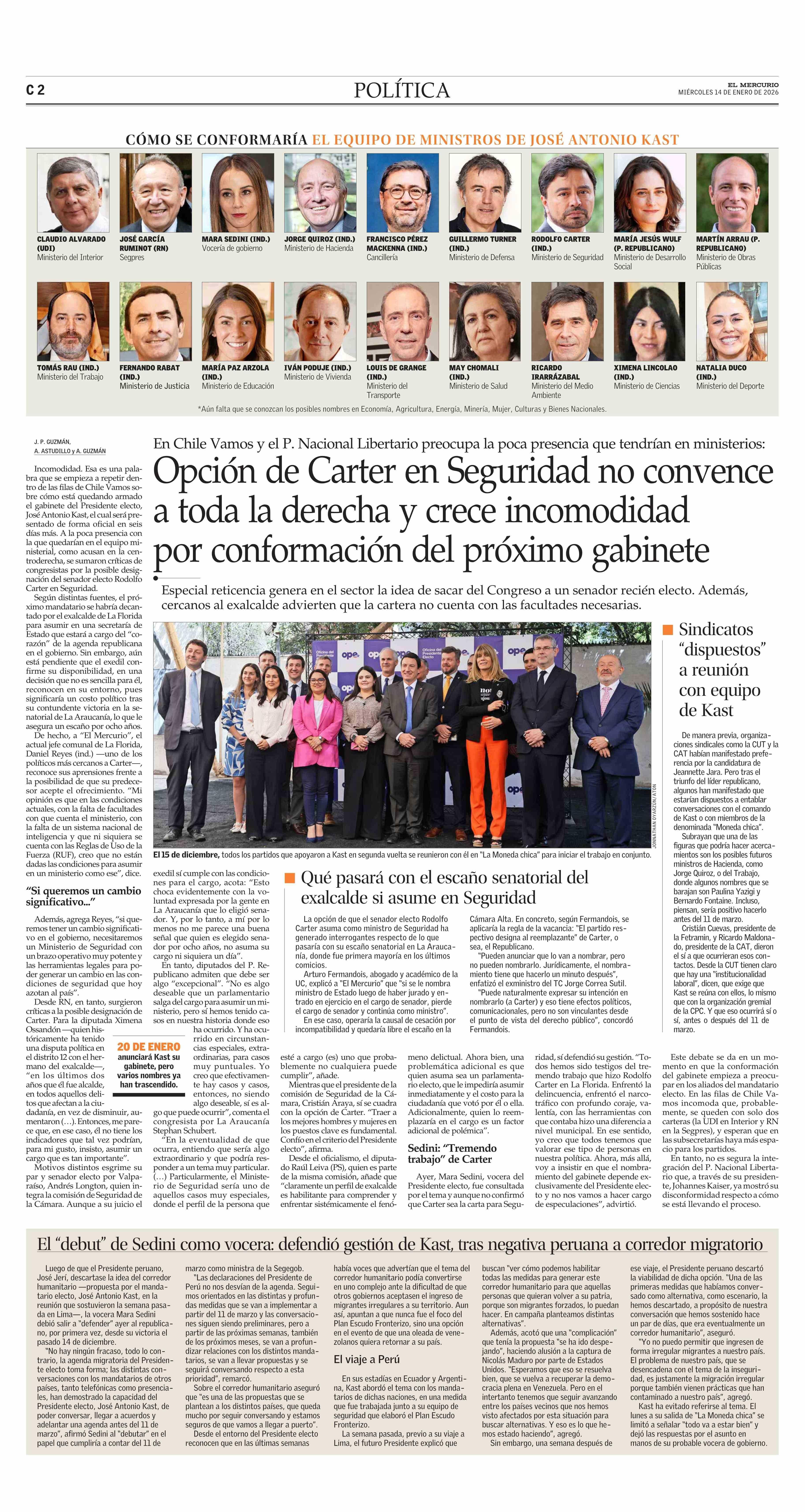 Título: Opción de Carter en Seguridad no convence a toda la derecha y crece incomodidad por conformación del próximo gabinete