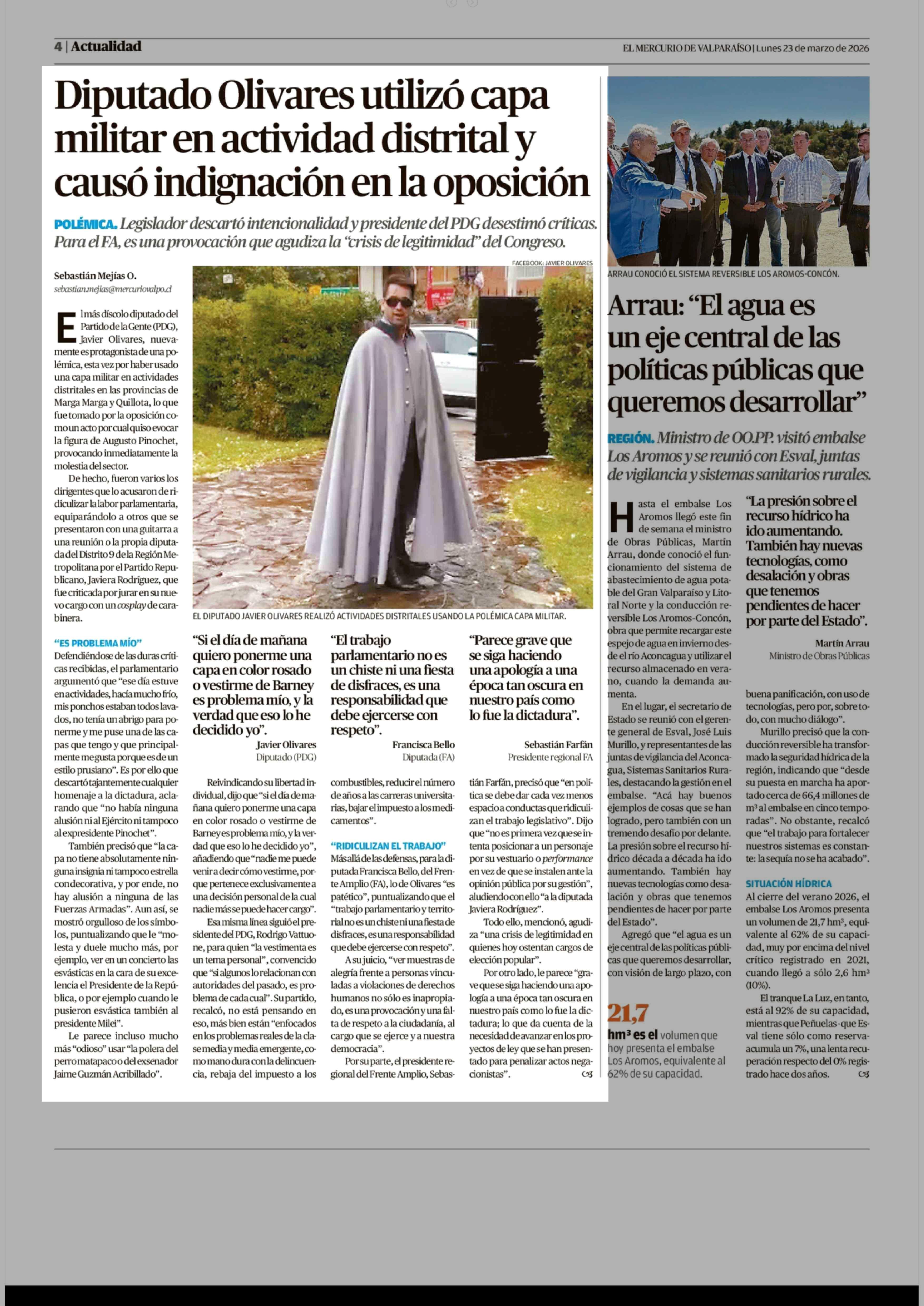 Diputado Olivares utilizó capa militar en actividad distrital y causó indignación en la oposición 23-03-2026 El Mercurio de Valparaíso |