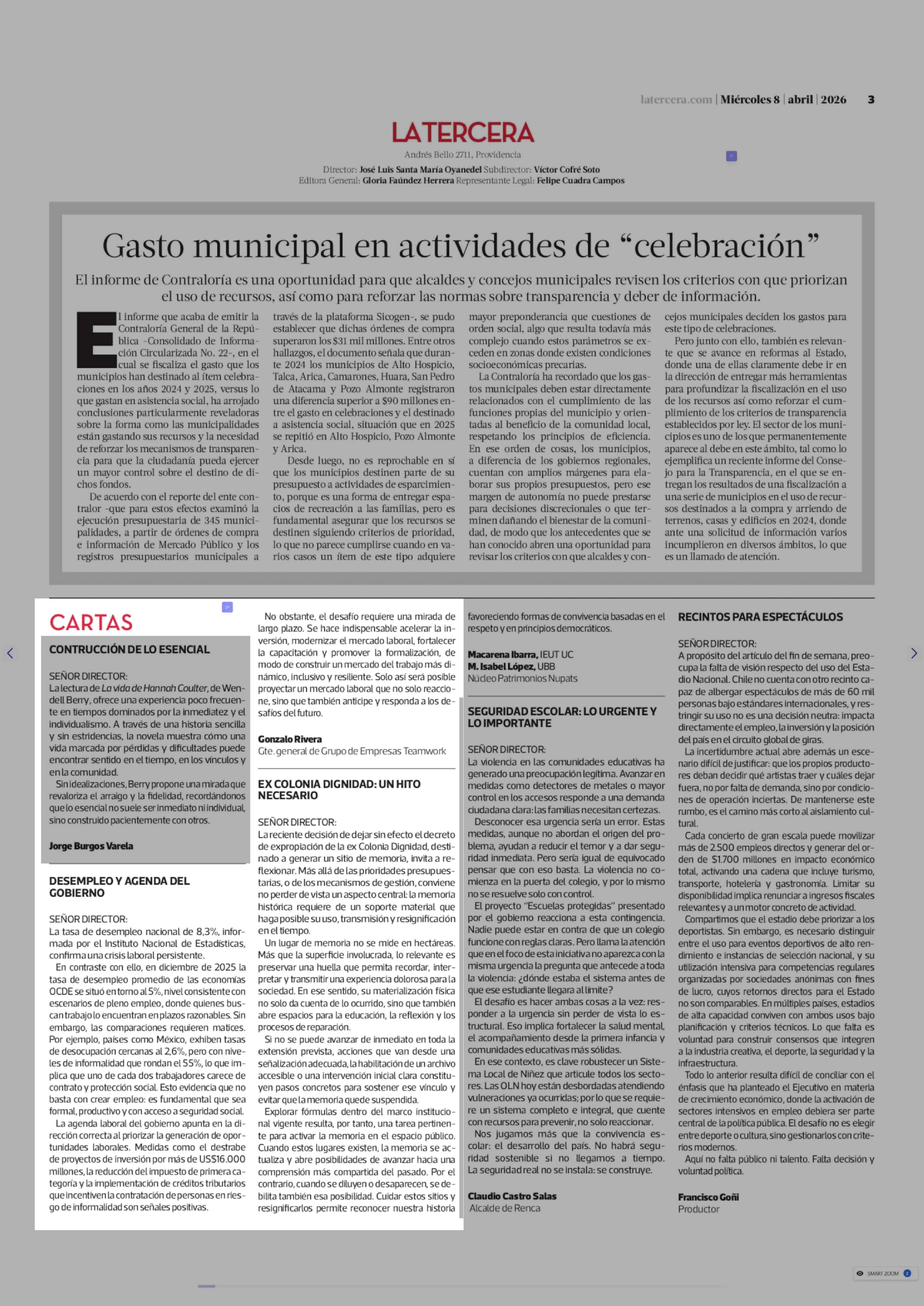 CARTAS: DESEMPLEO Y AGENDA DEL GOBIERNO 08-04-2026 La Tercera |