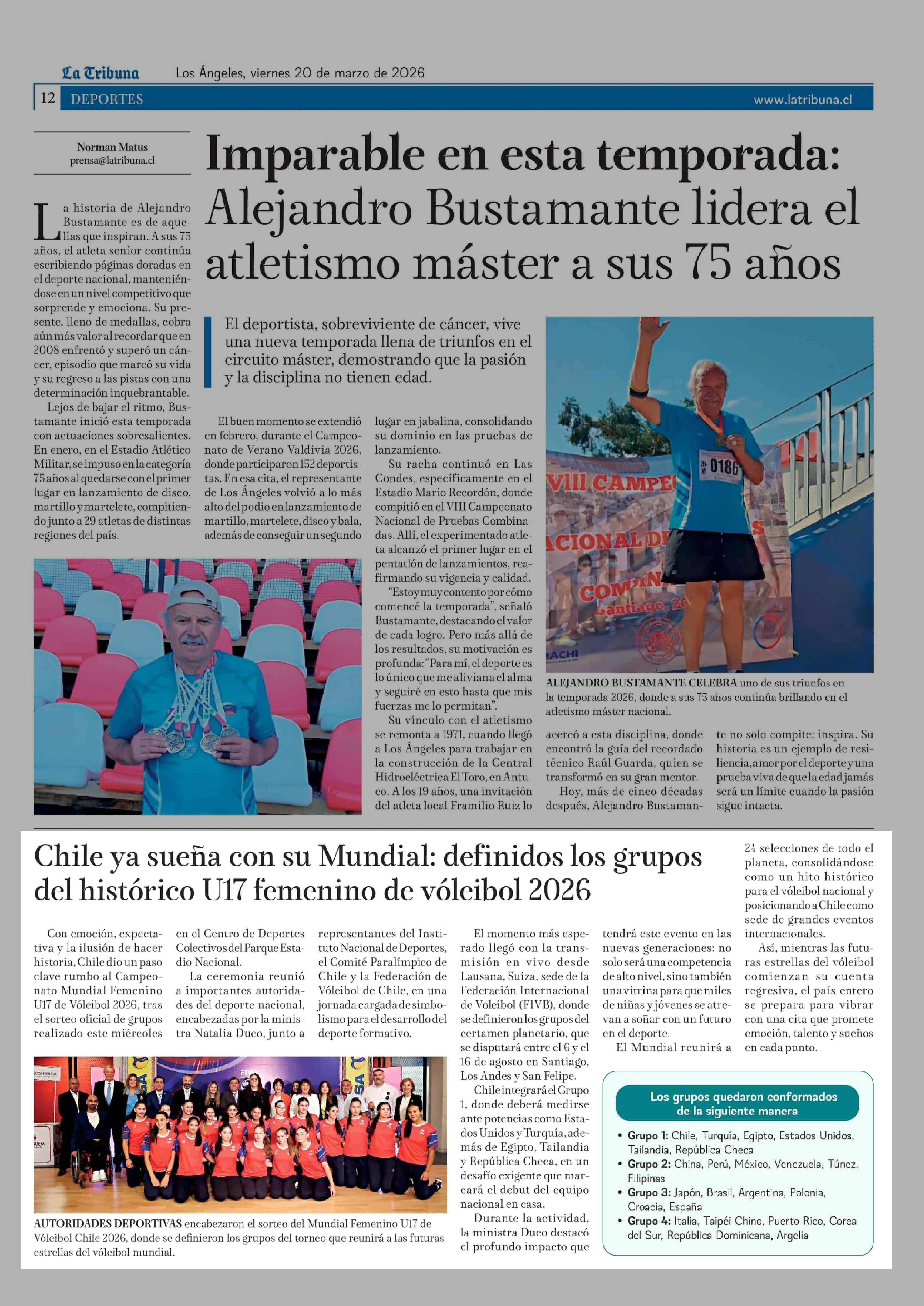 Chile ya sueña con su Mundial: definidos los grupos del histórico U17 femenino de vóleibol 2026 20-03-2026 La Tribuna |