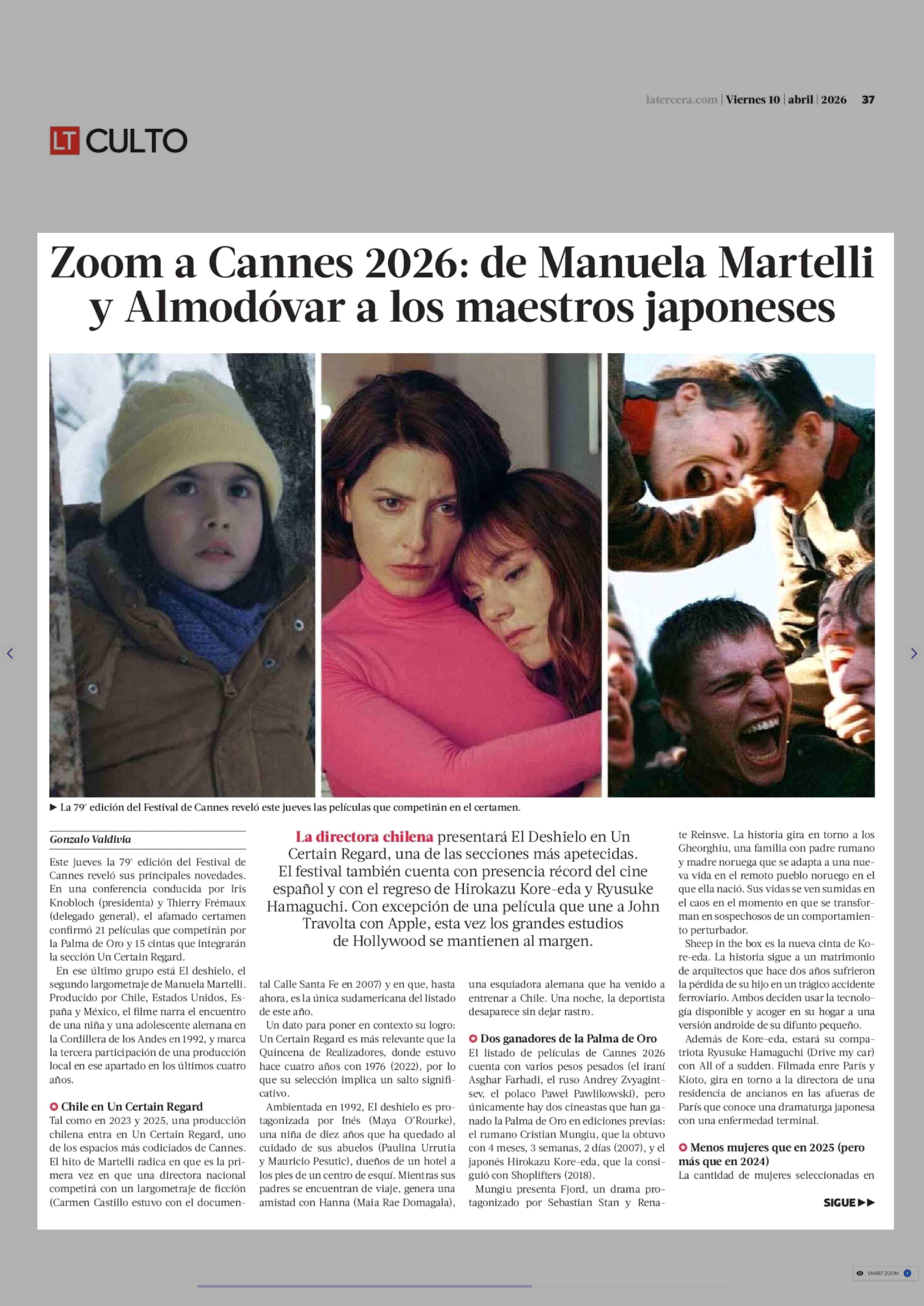 Zoom a Cannes 2026: de Manuela Martelli y Almodóvar a los maestros japoneses 10-04-2026 La Tercera |