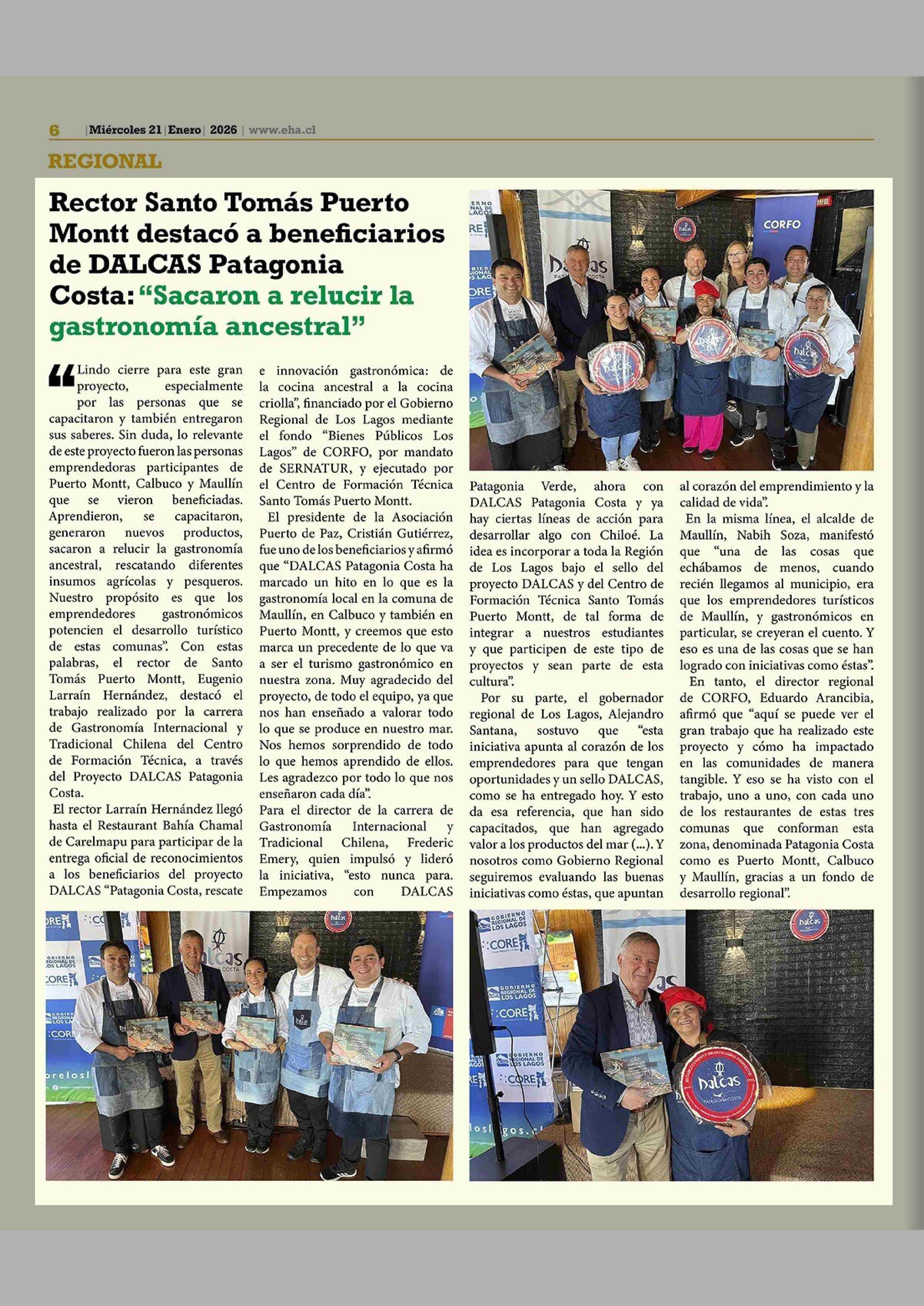 Rector Santo Tomás Puerto Montt destacó a beneficiarios de DALCAS Patagonia Costa: "Sacaron a relucir la gastronomía ancestral" 21-01-2026 El Heraldo Austral |