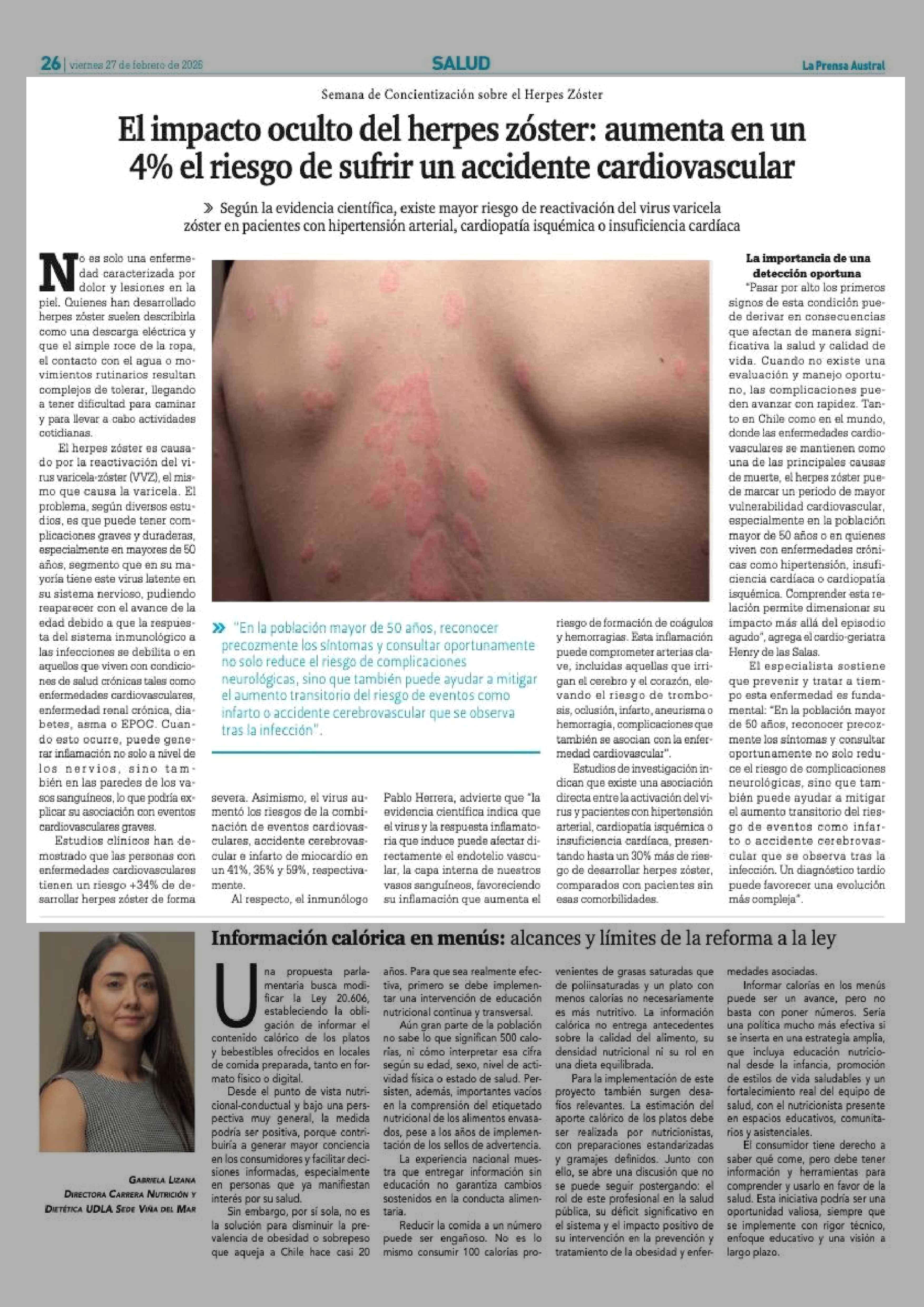El impacto oculto del herpes zóster: aumenta en un 4% el riesgo de sufrir un accidente cardiovascular 27-02-2026 La Prensa Austral |
