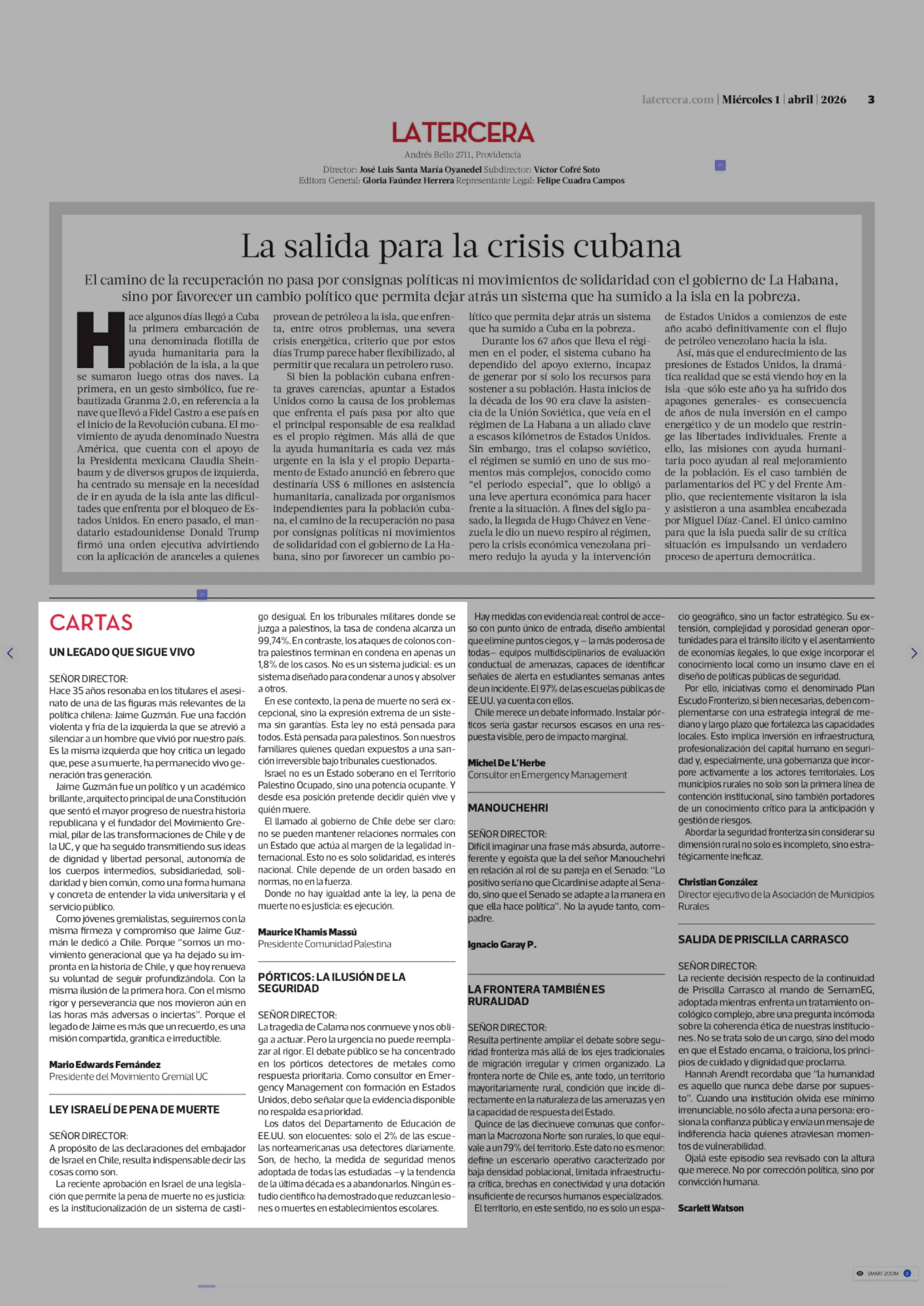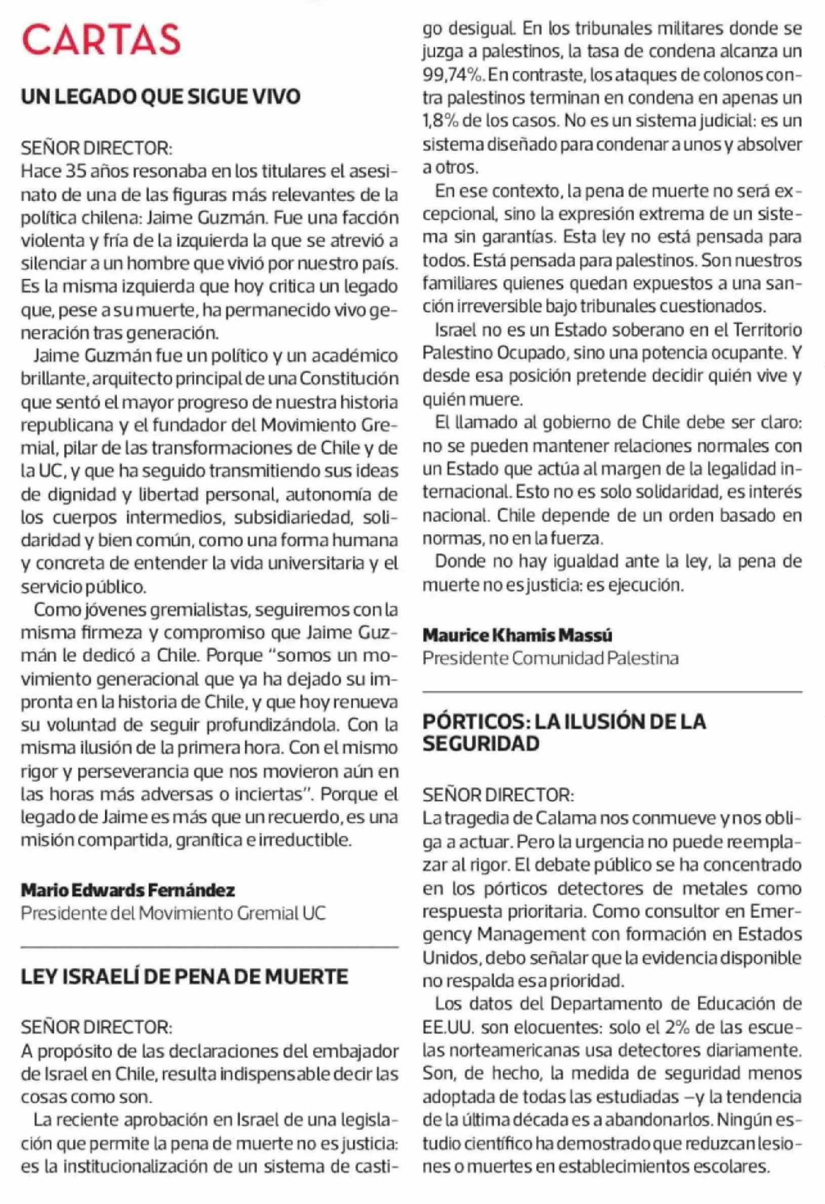 Cartas: LEY ISRAELÍ DE PENA DE MUERTE 01-04-2026 La Tercera |