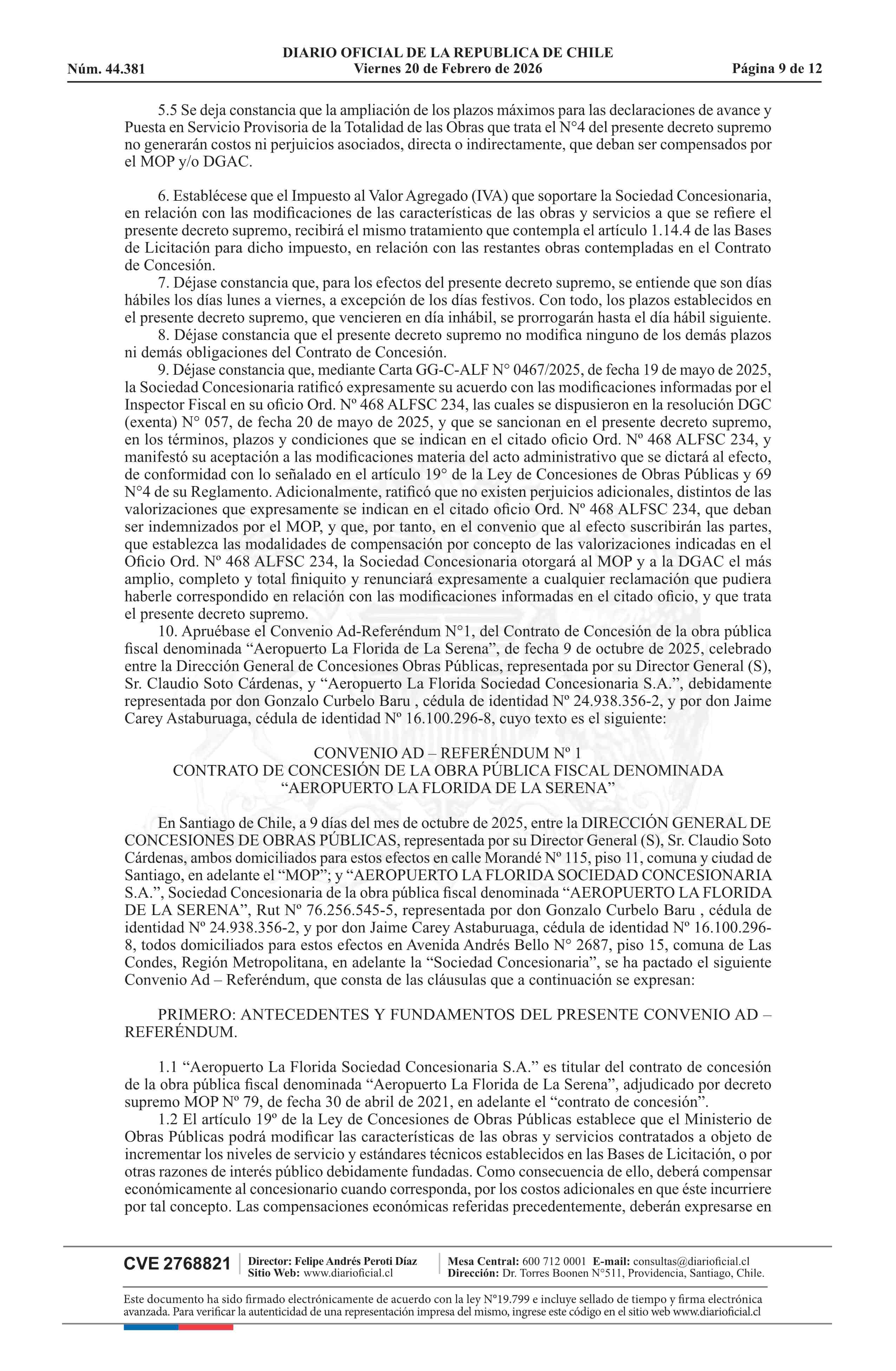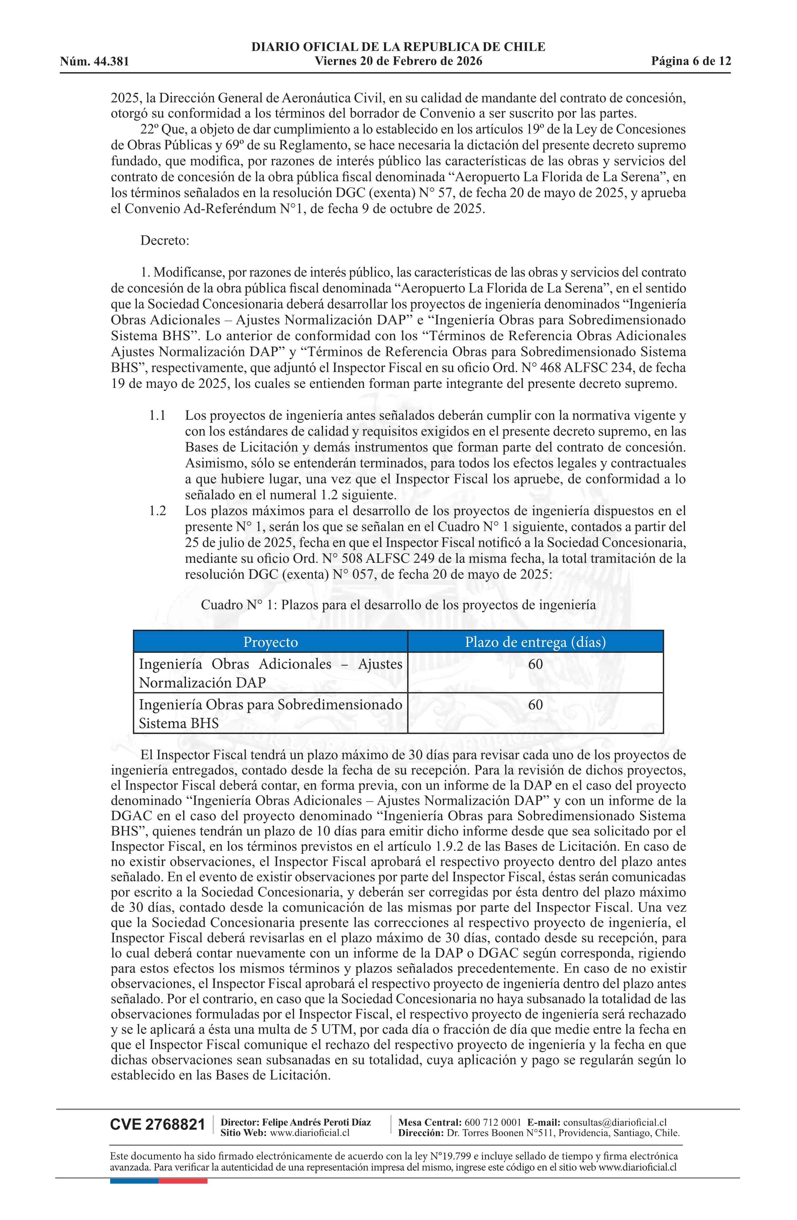 Título: Decreto número 136, de 2025.- Modifica, por razones de interés público, las características de las obras y servicios que indica del contrato de concesión de la obra pública fiscal denominada Aeropuerto La Florida de La Serena