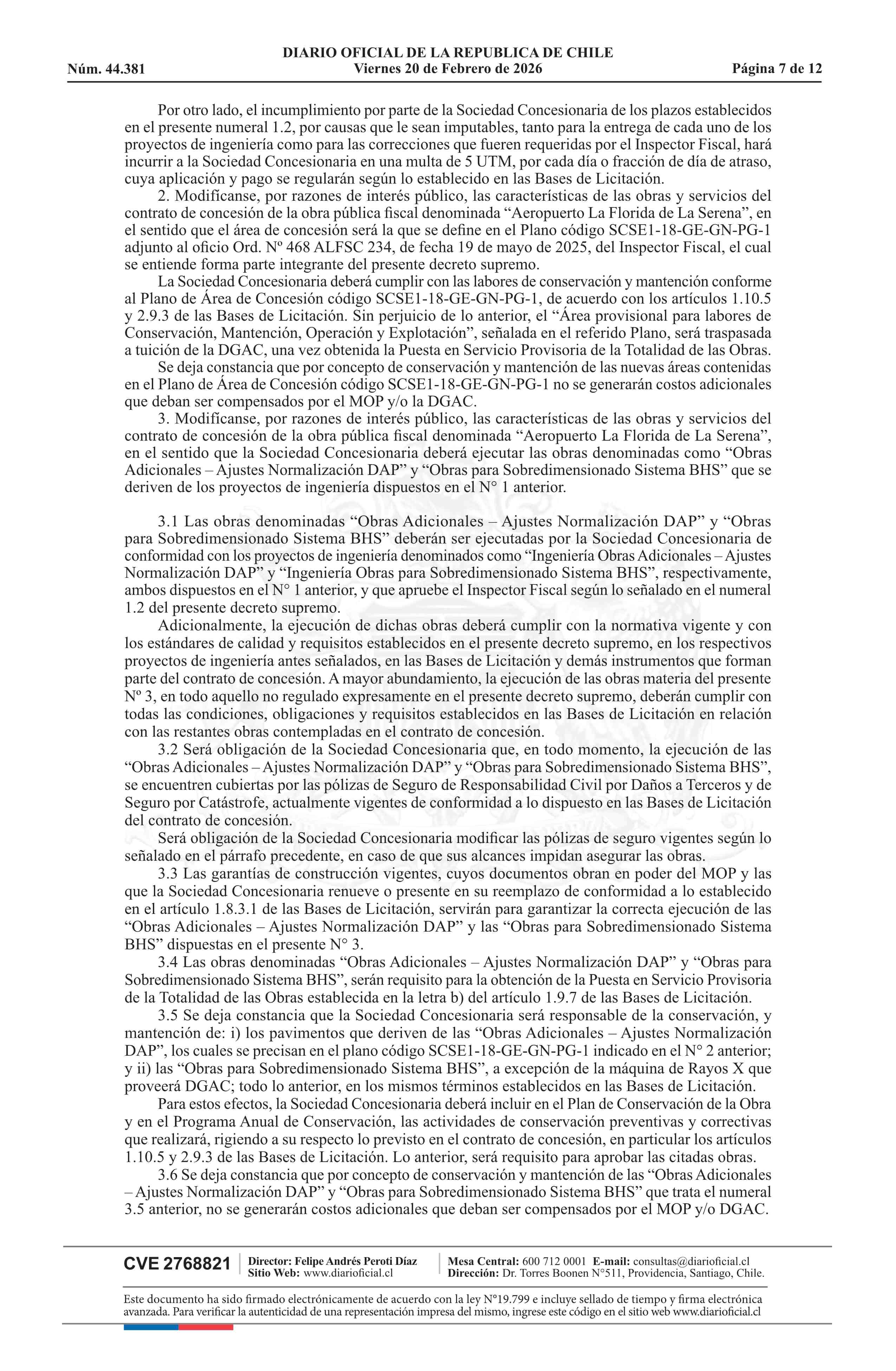 Decreto número 136, de 2025.- Modifica, por razones de interés público, las características de las obras y servicios que indica del contrato de concesión de la obra pública fiscal denominada Aeropuerto La Florida de La Serena