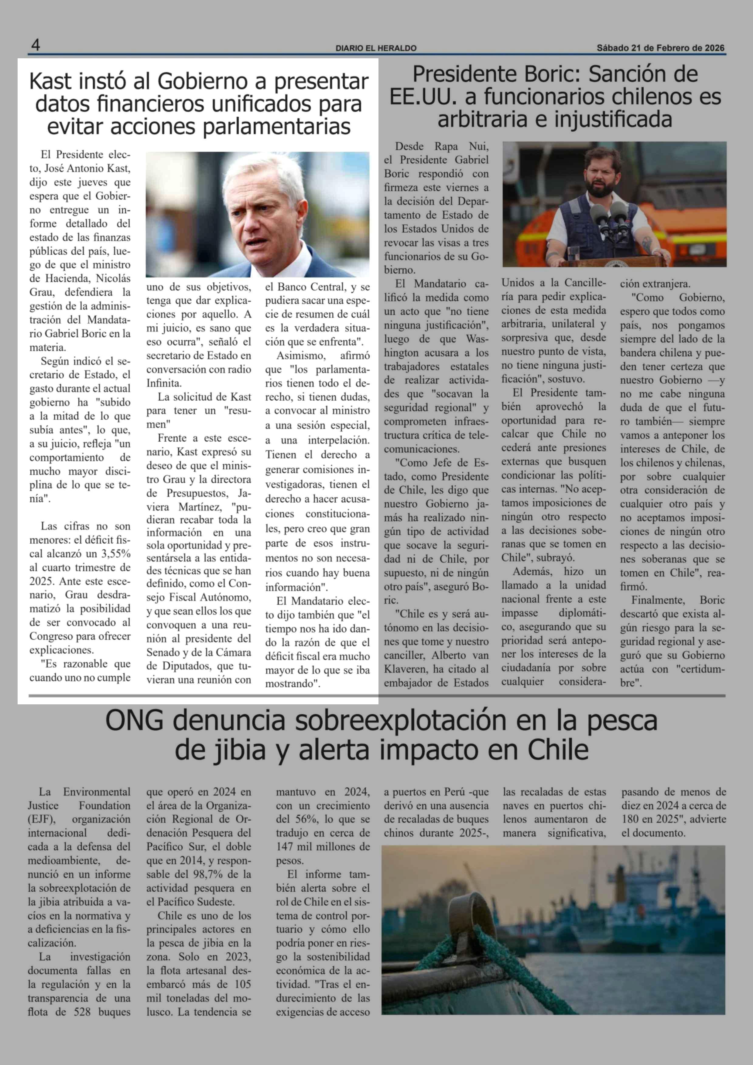 Kast instó al Gobierno a presentar datos financieros unificados para evitar acciones parlamentarias 21-02-2026 El Heraldo |