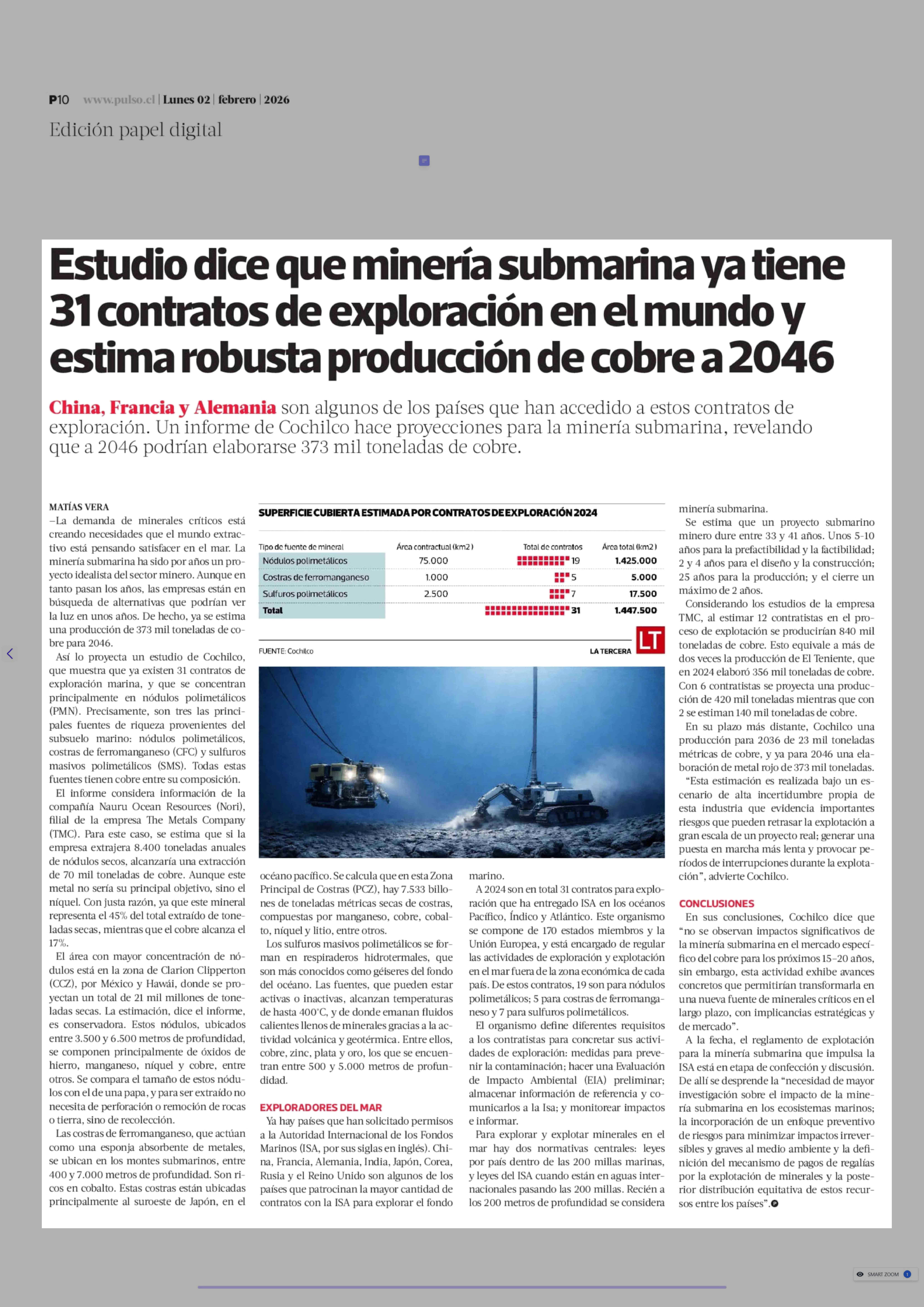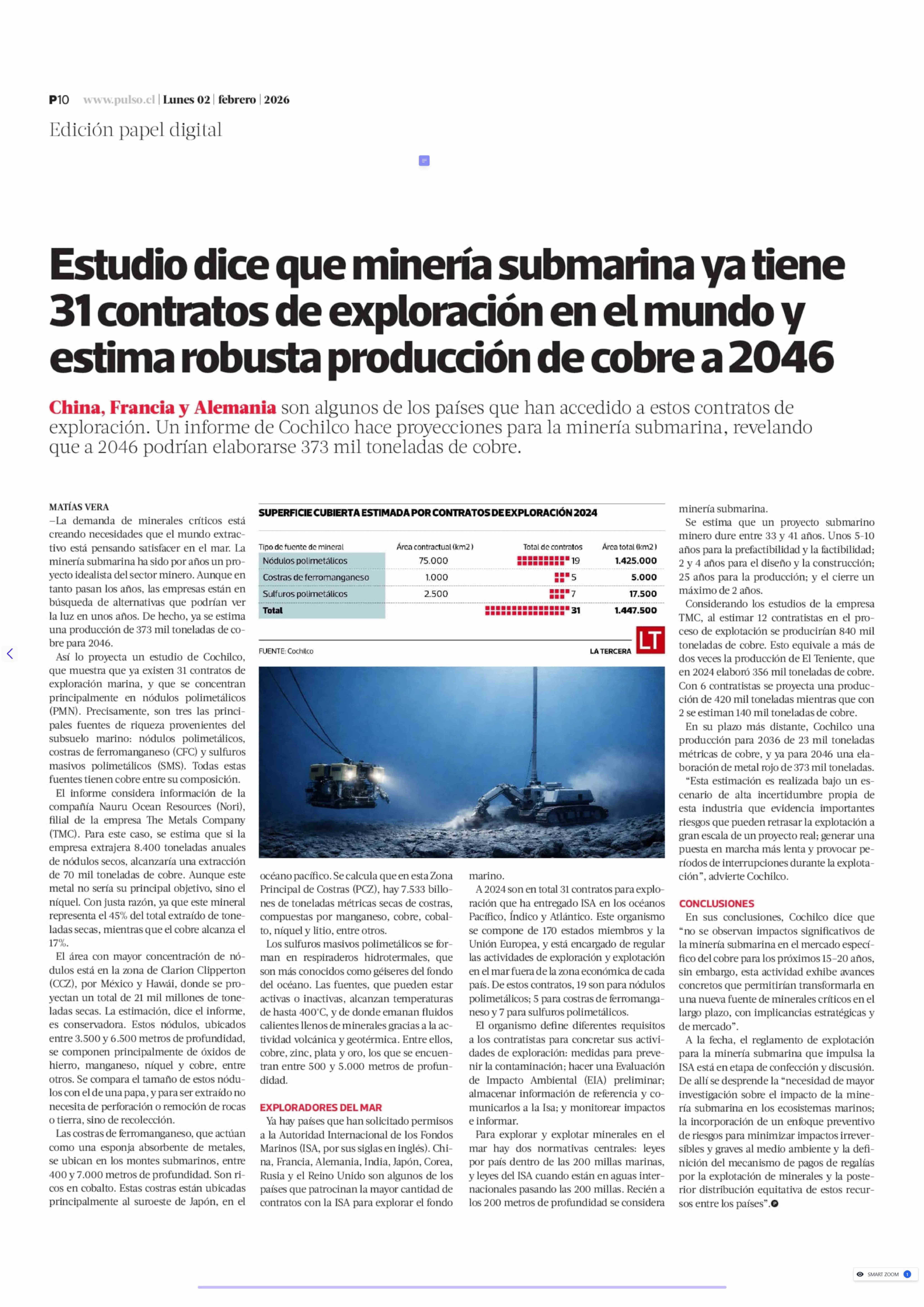 Título: Estudio dice que minería submarina ya tiene 31 contratos de exploración en el mundo y estima robusta producción de cobre a 2046