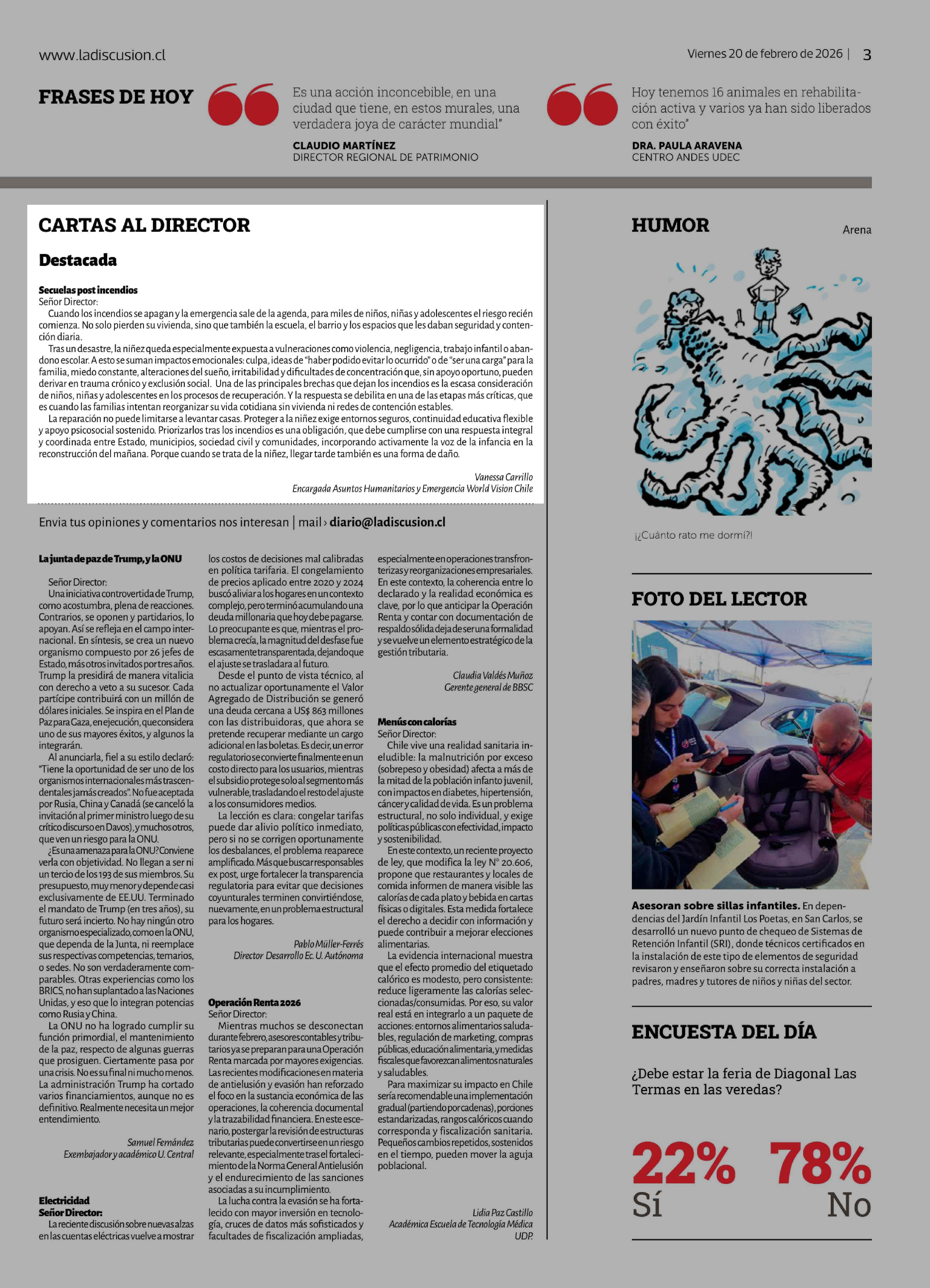 | Título: | Cartas: Secuelas post incendios Señor Director: Cuando los incendios se apagan y la emergencia sale de la agenda, para miles de niños, niñas y adolescentes el riesgo recién comienza. No solo pierden su vivienda, sino que también la escuela, el barrio y los espacios que les daban seguridad y contenci |