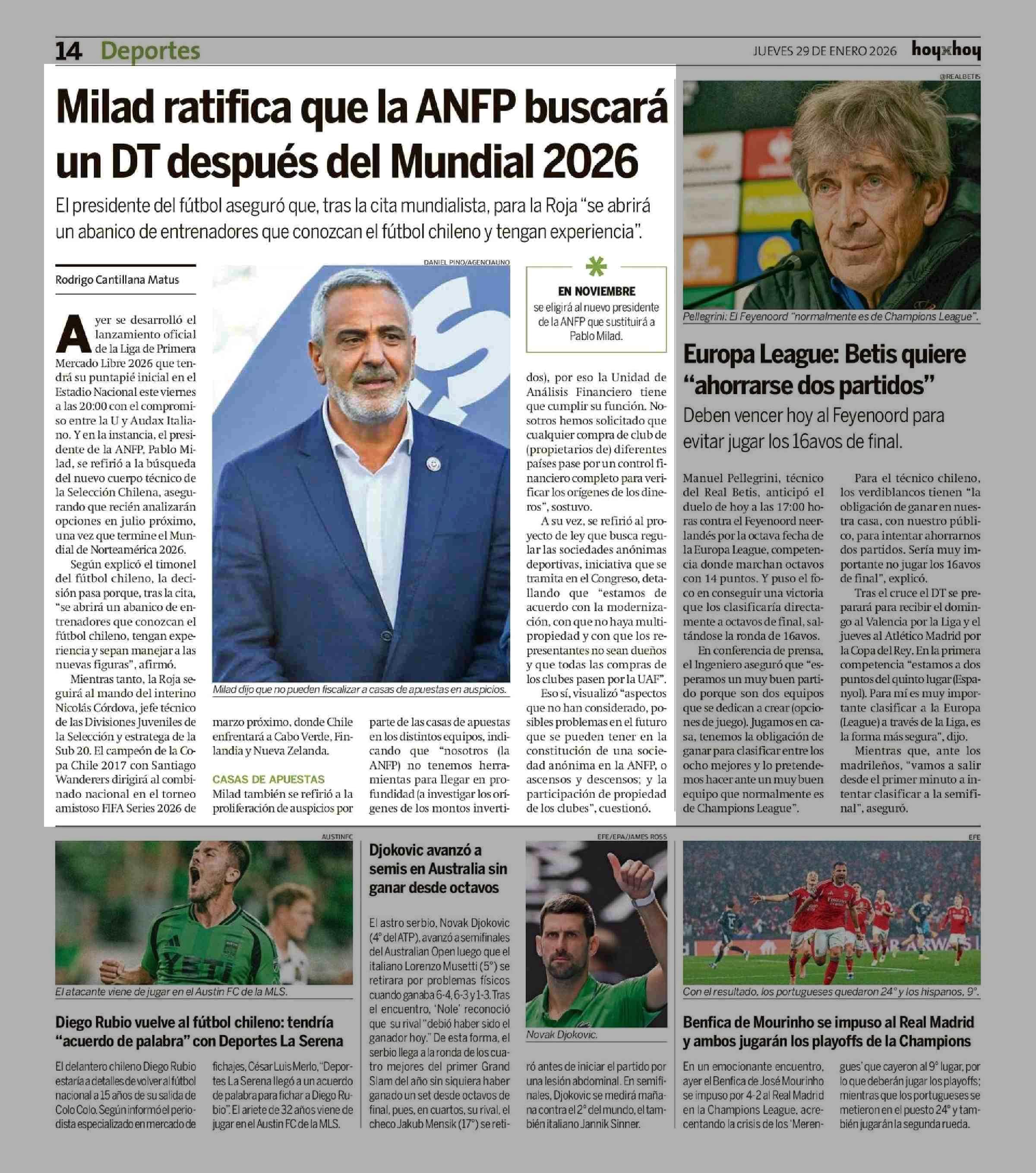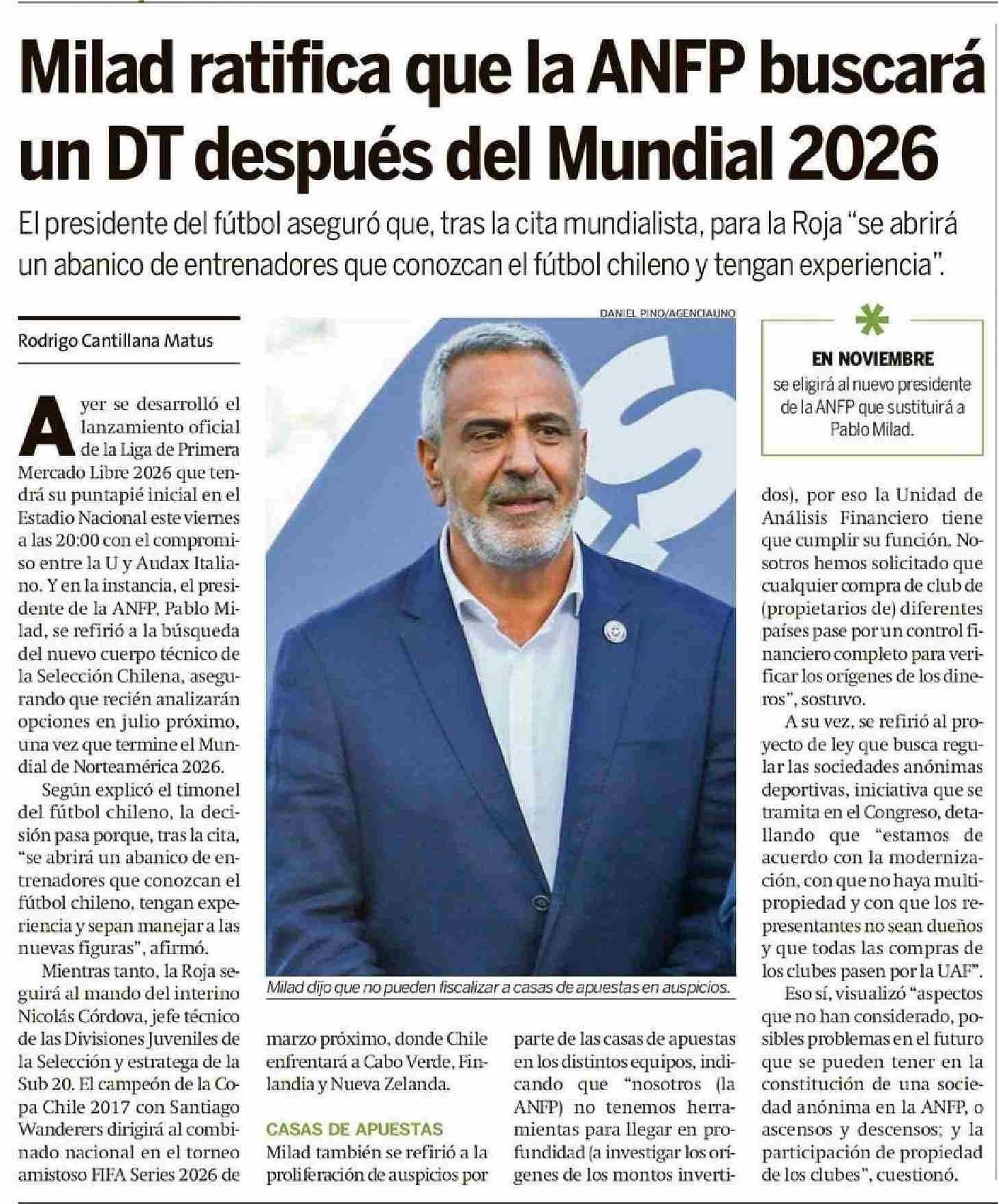 Título: Milad ratifica que la ANFP buscará un DT después del Mundial 2026
