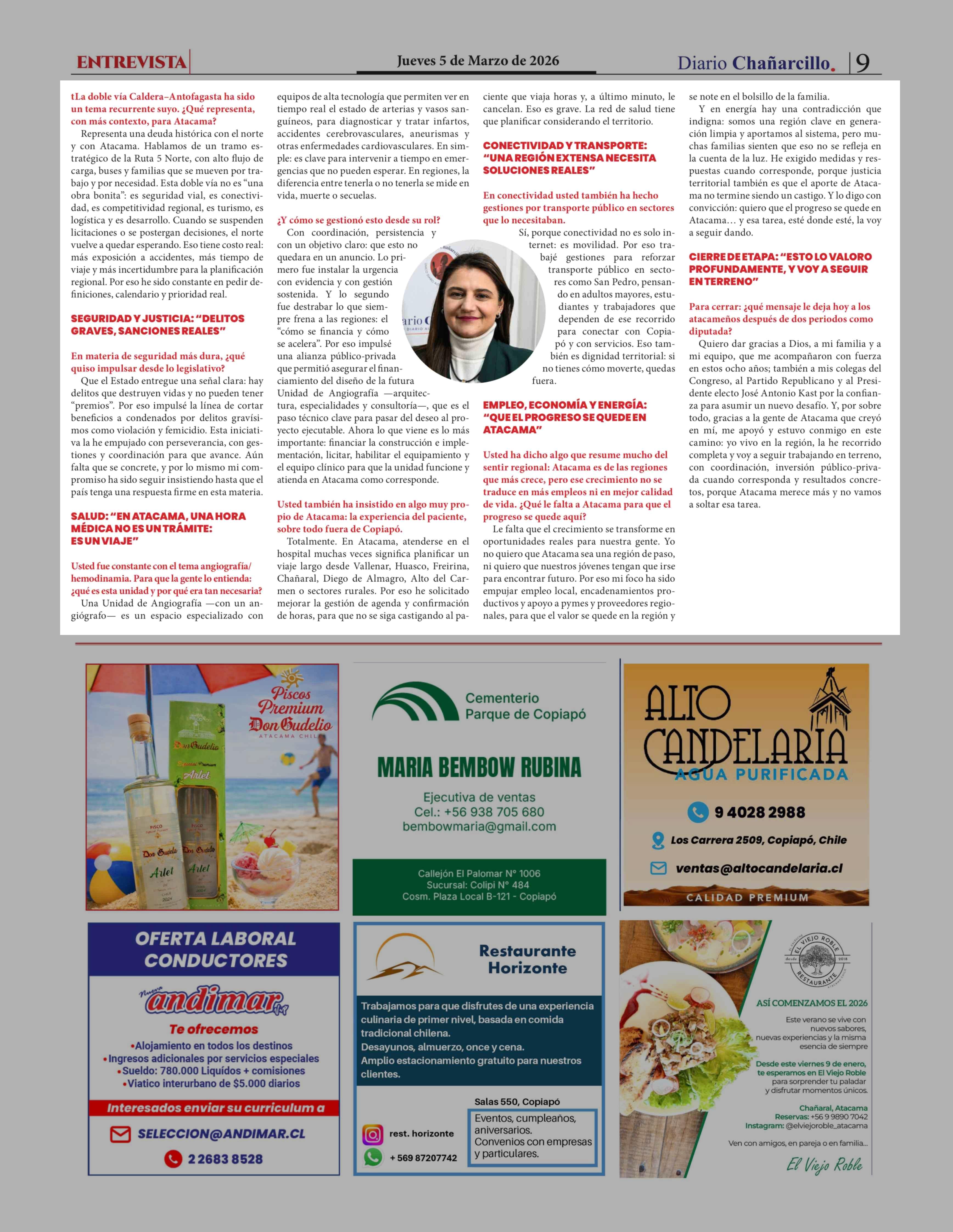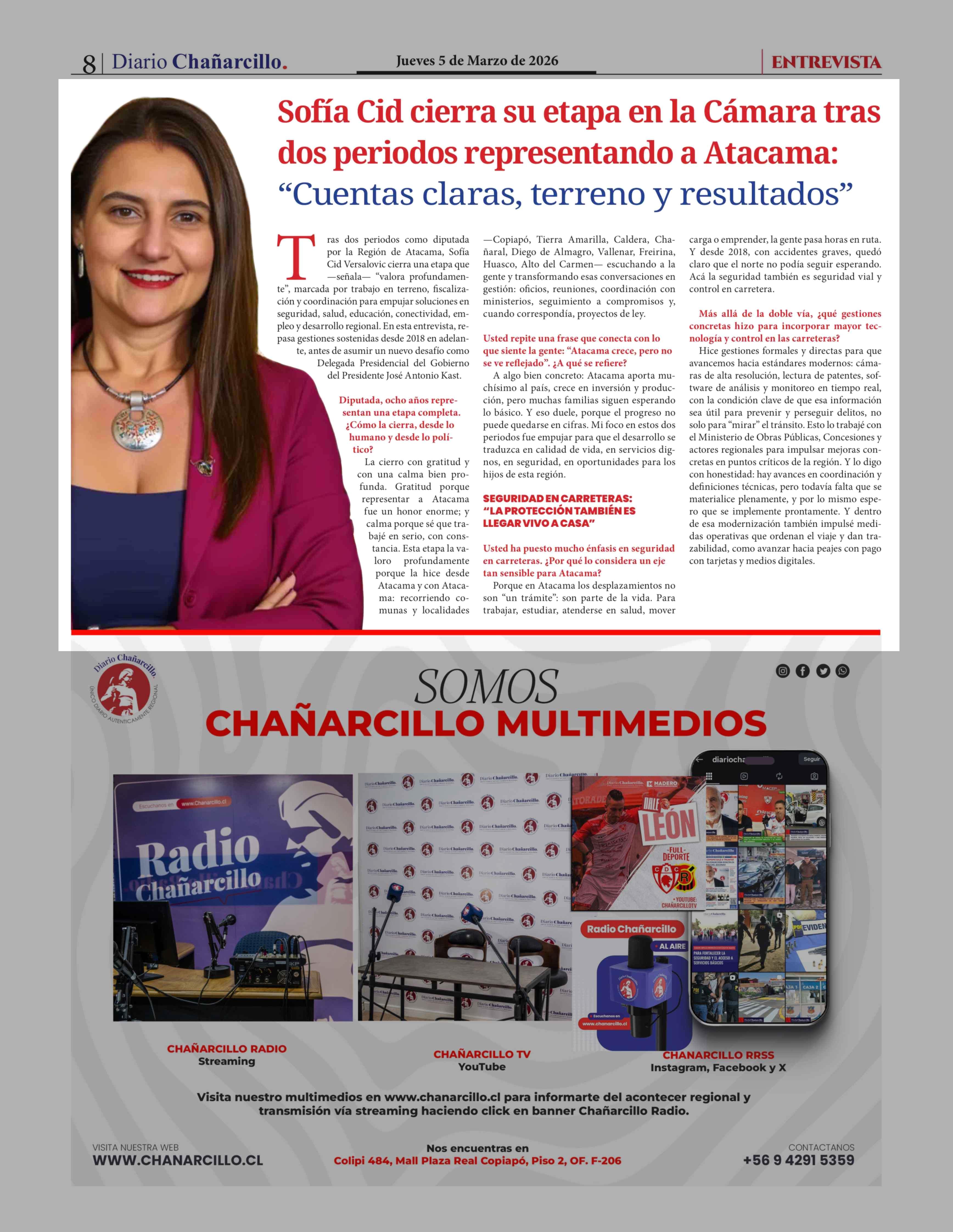 Sofía Cid cierra su etapa en la Cámara tras dos periodos representando a Atacama: "Cuentas claras, terreno y resultados" 05-03-2026 Diario Chañarcillo |