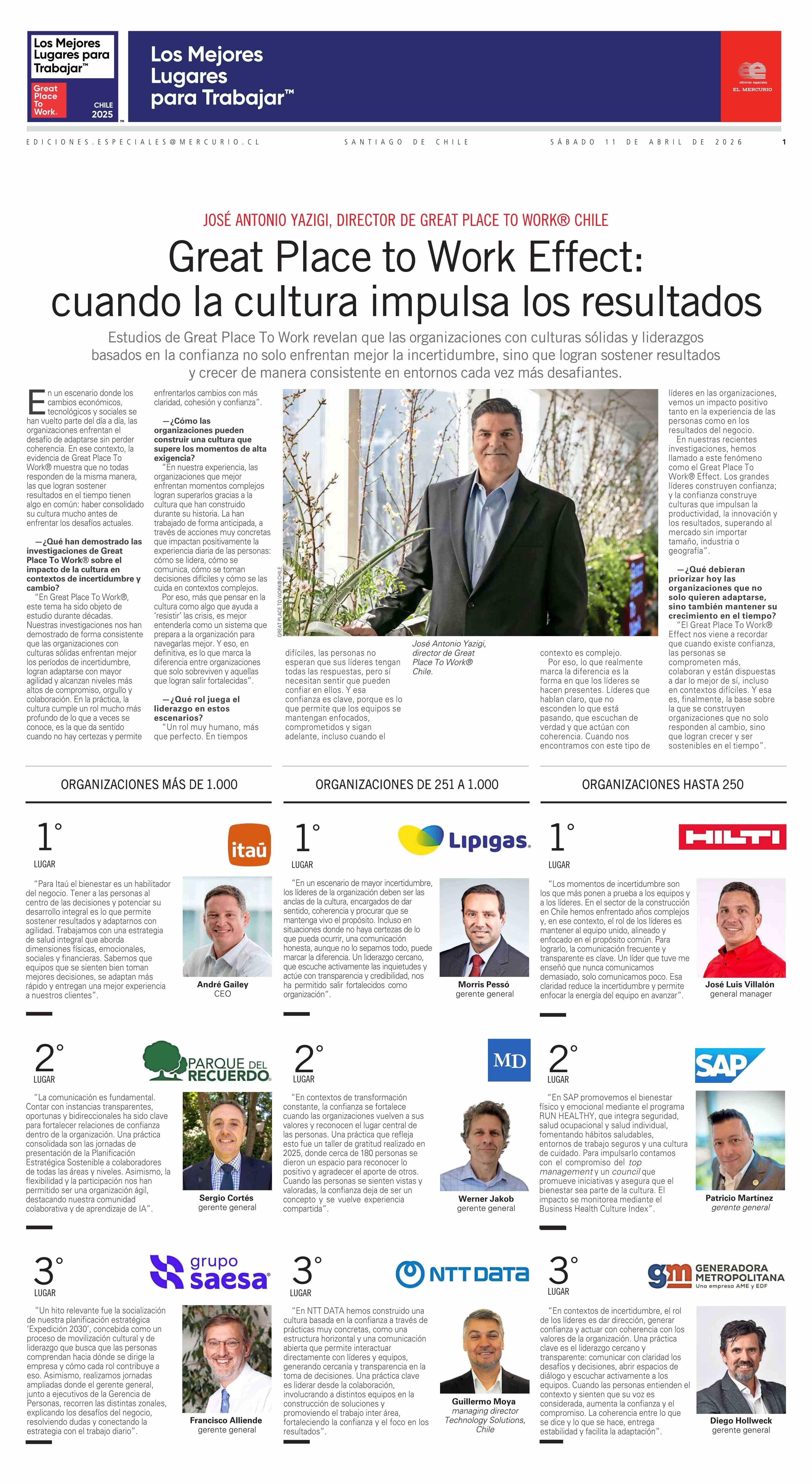Great Place to Work Effect: cuando la cultura impulsa los resultados 11-04-2026 El Mercurio |