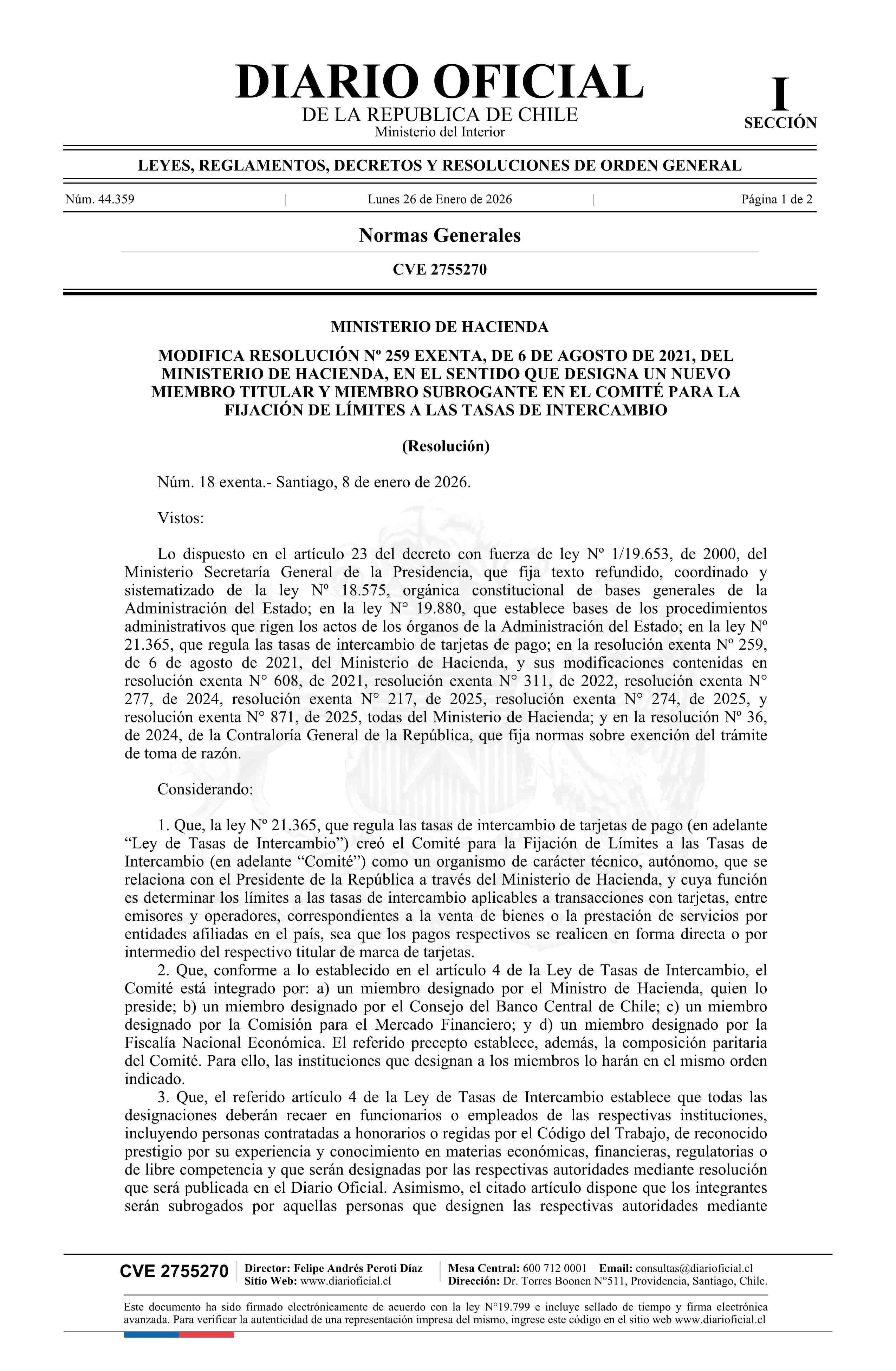 Resolución exenta número 18, de 2026.- Modifica resolución Nº 259 exenta, de 2021, en el sentido que designa un nuevo miembro titular y miembro subrogante en el Comité para la Fijación de Límites a las Tasas de Intercambio 26-01-2026 DIARIO OFICIAL CHILE - BOLETÍN OFICIAL DE MINERÍA |