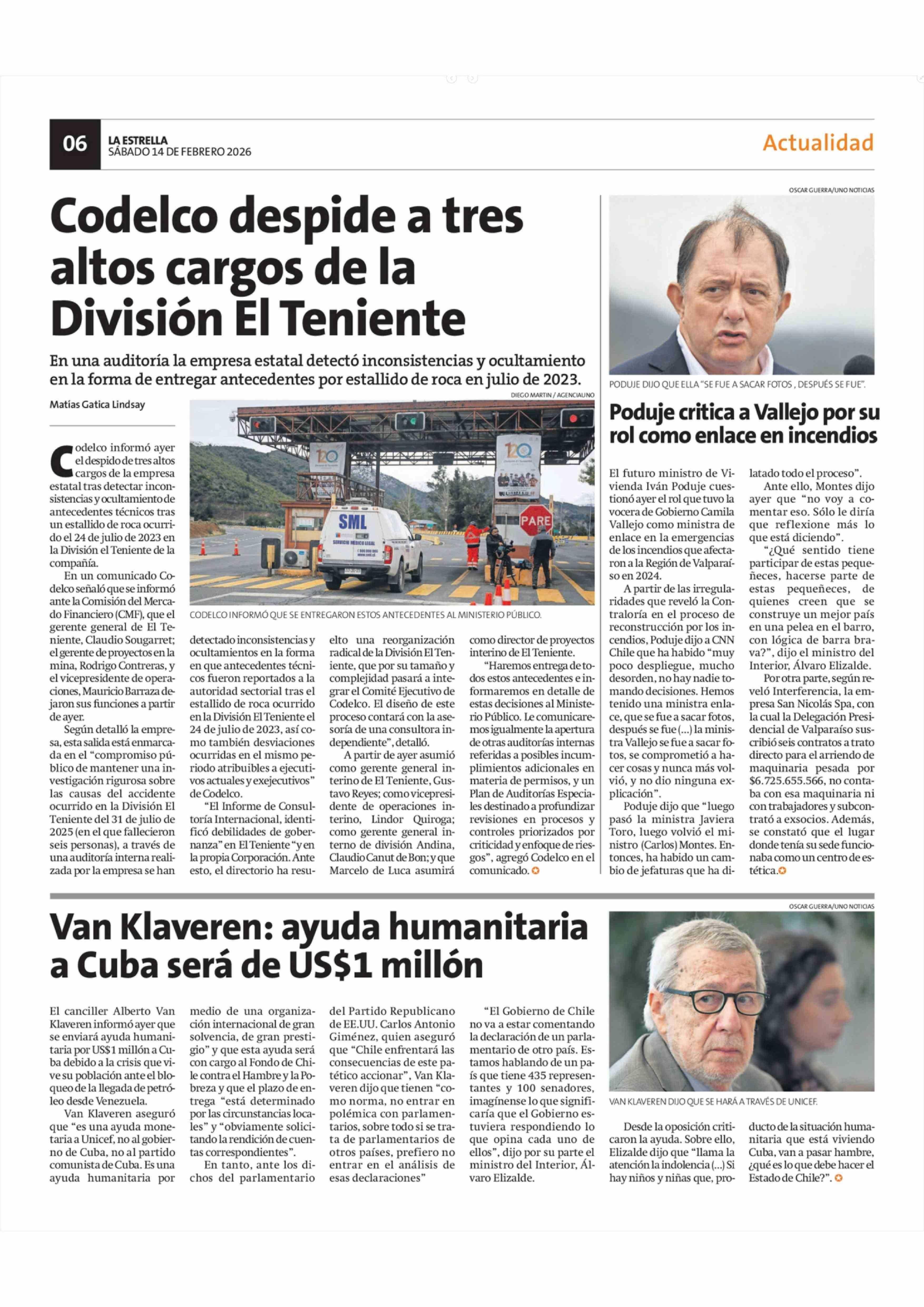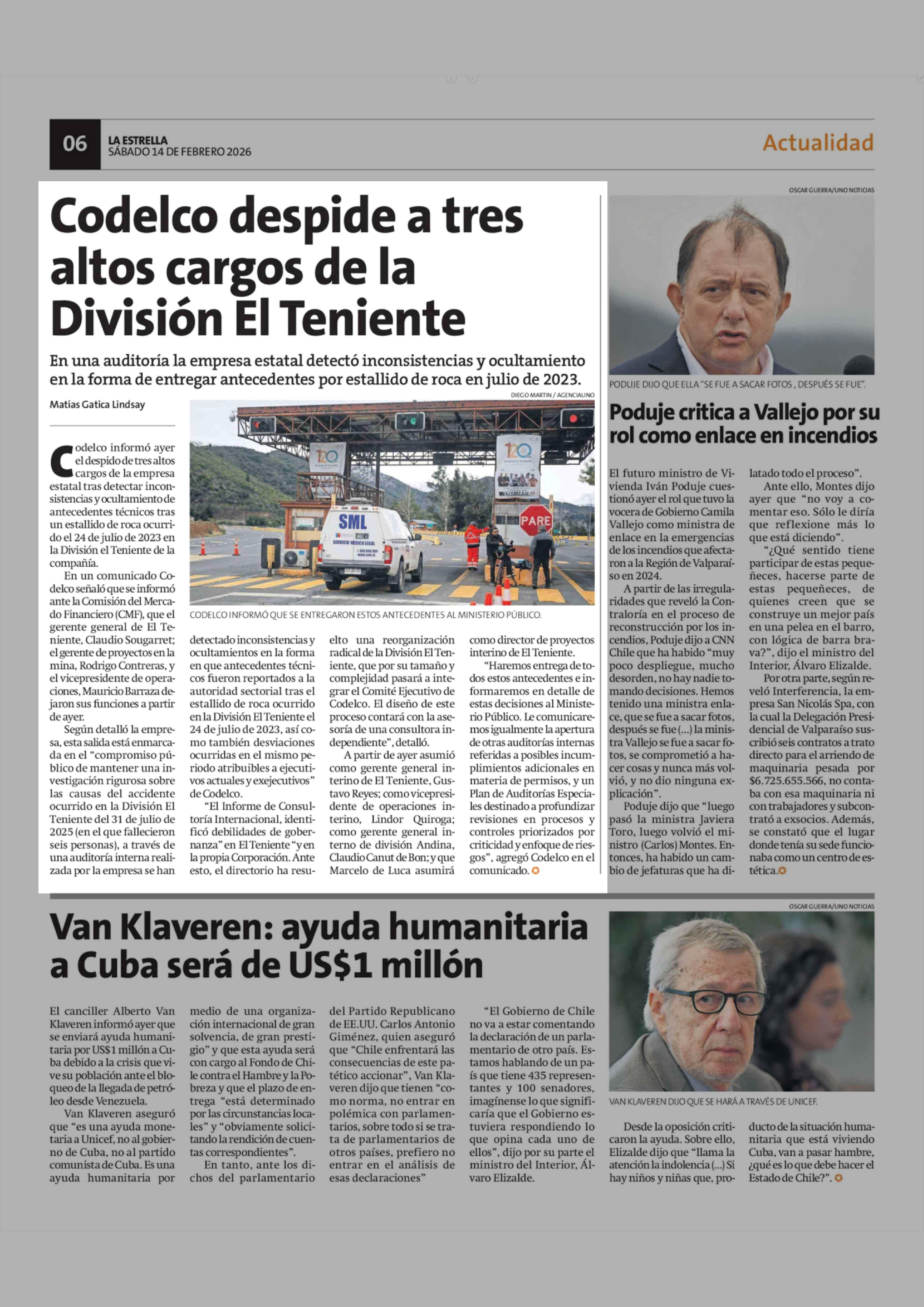 Codelco despide a tres altos cargos de la División El Teniente 15-02-2026 La Estrella de Antofagasta |