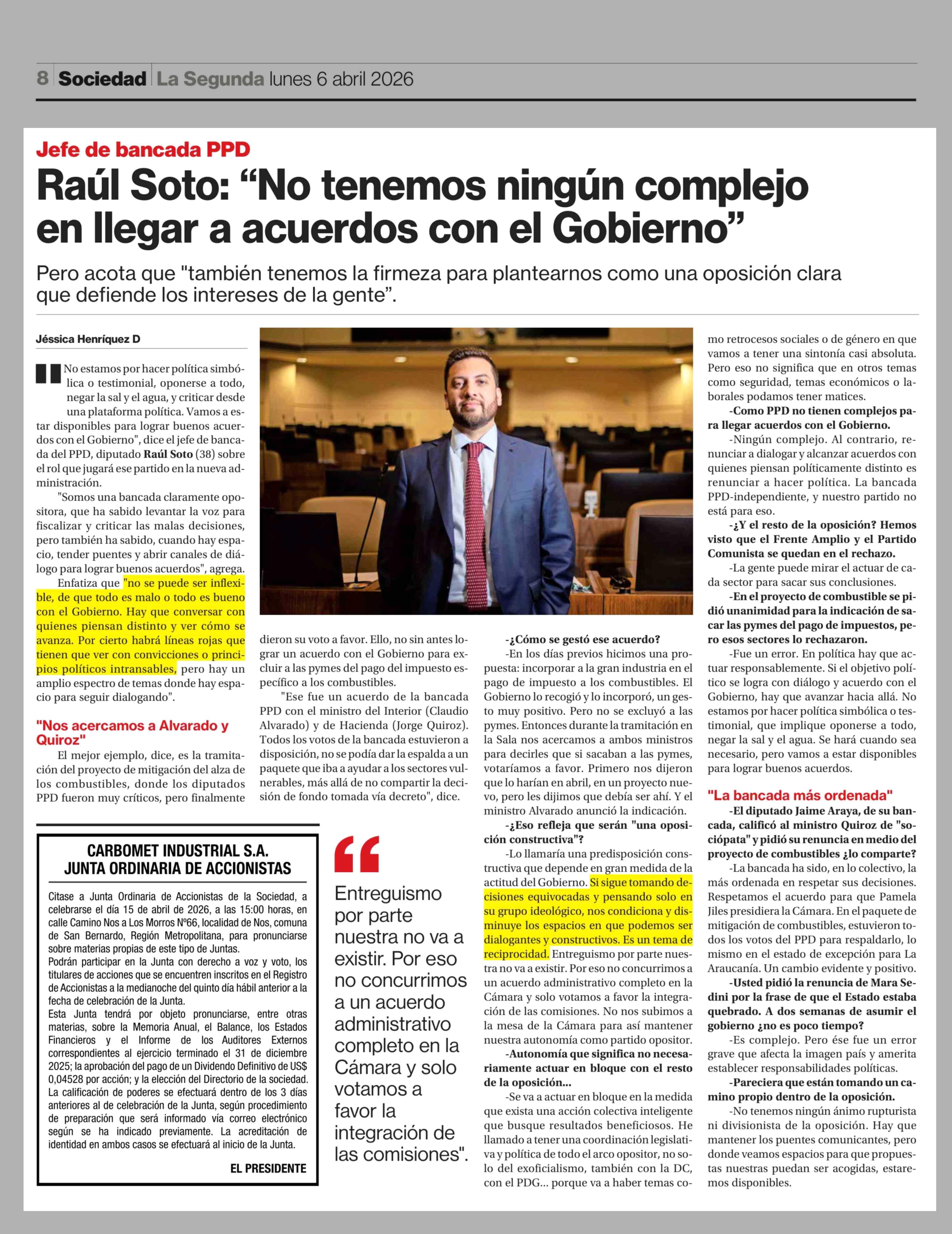 Raúl Soto: "No tenemos ningún complejo en llegar a acuerdos con el Gobierno" 06-04-2026 La Segunda |