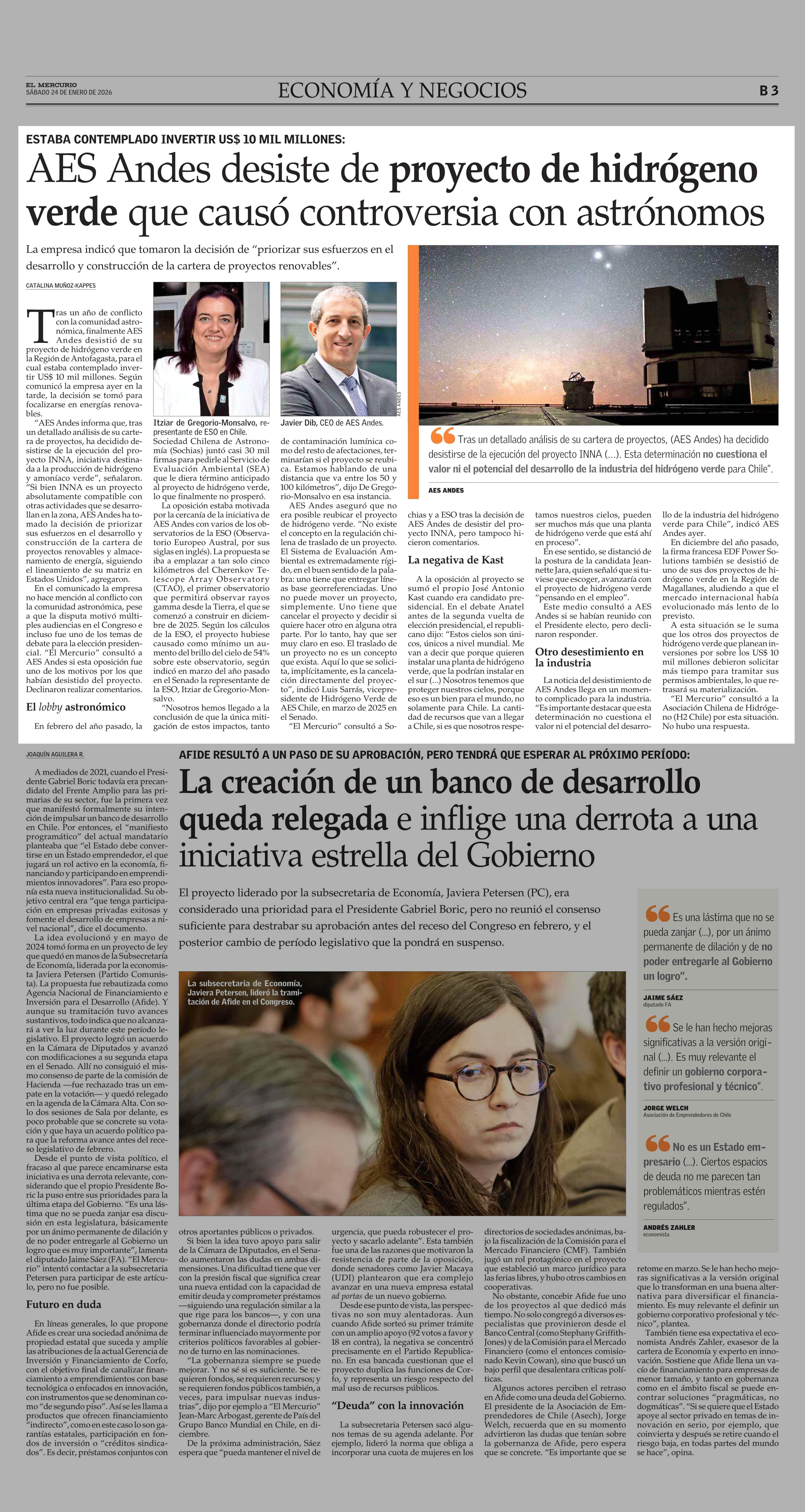 Título: AES Andes desiste de proyecto de hidrógeno verde que causó controversia con astrónomos
