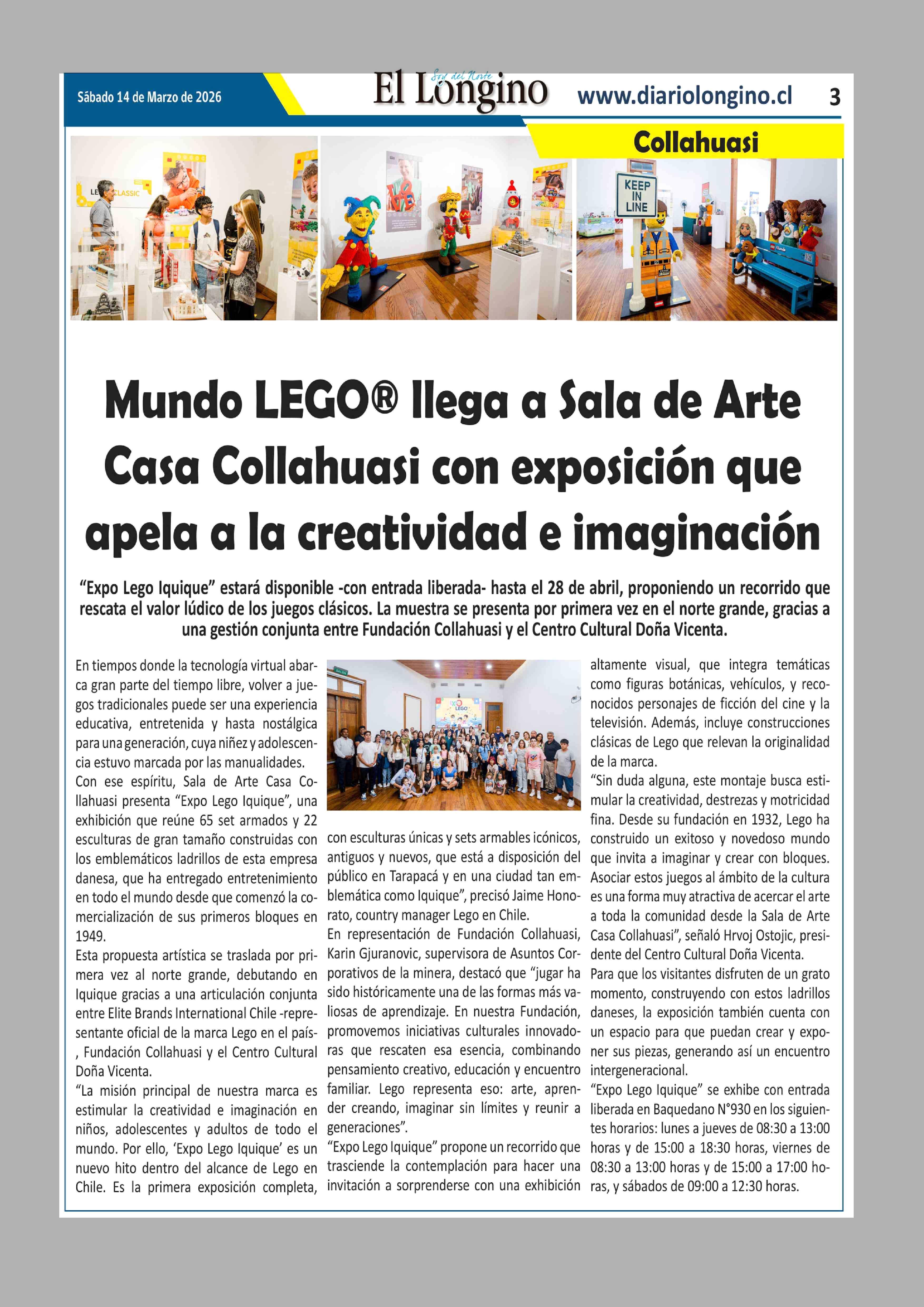 Mundo LEGO® llega a Sala de Arte Casa Collahuasi con exposición que apela a la creatividad e imaginación 14-03-2026 El Longino |