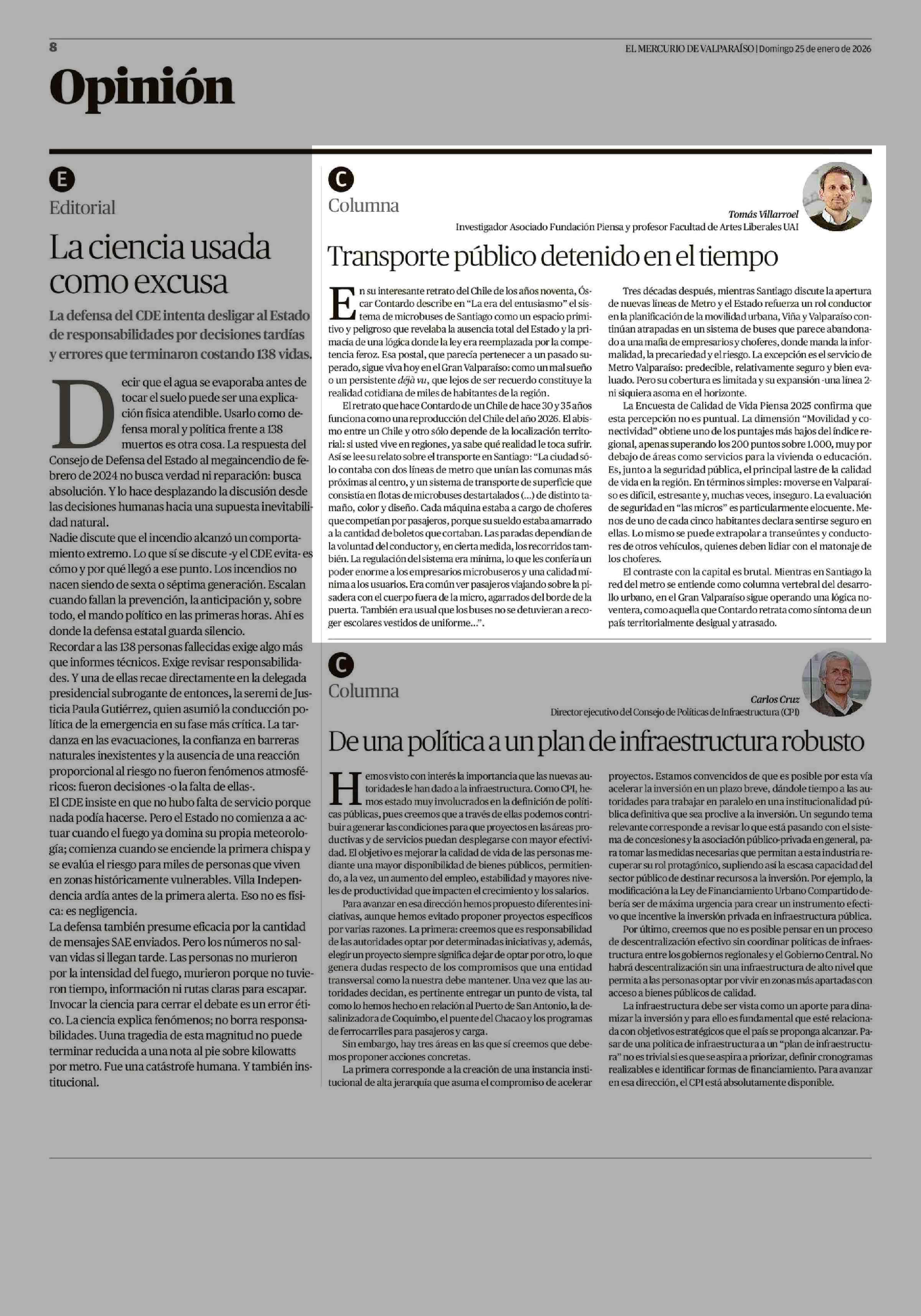 Columnas de Opinión: Transporte público detenido en el tiempo 25-01-2026 El Mercurio de Valparaíso |