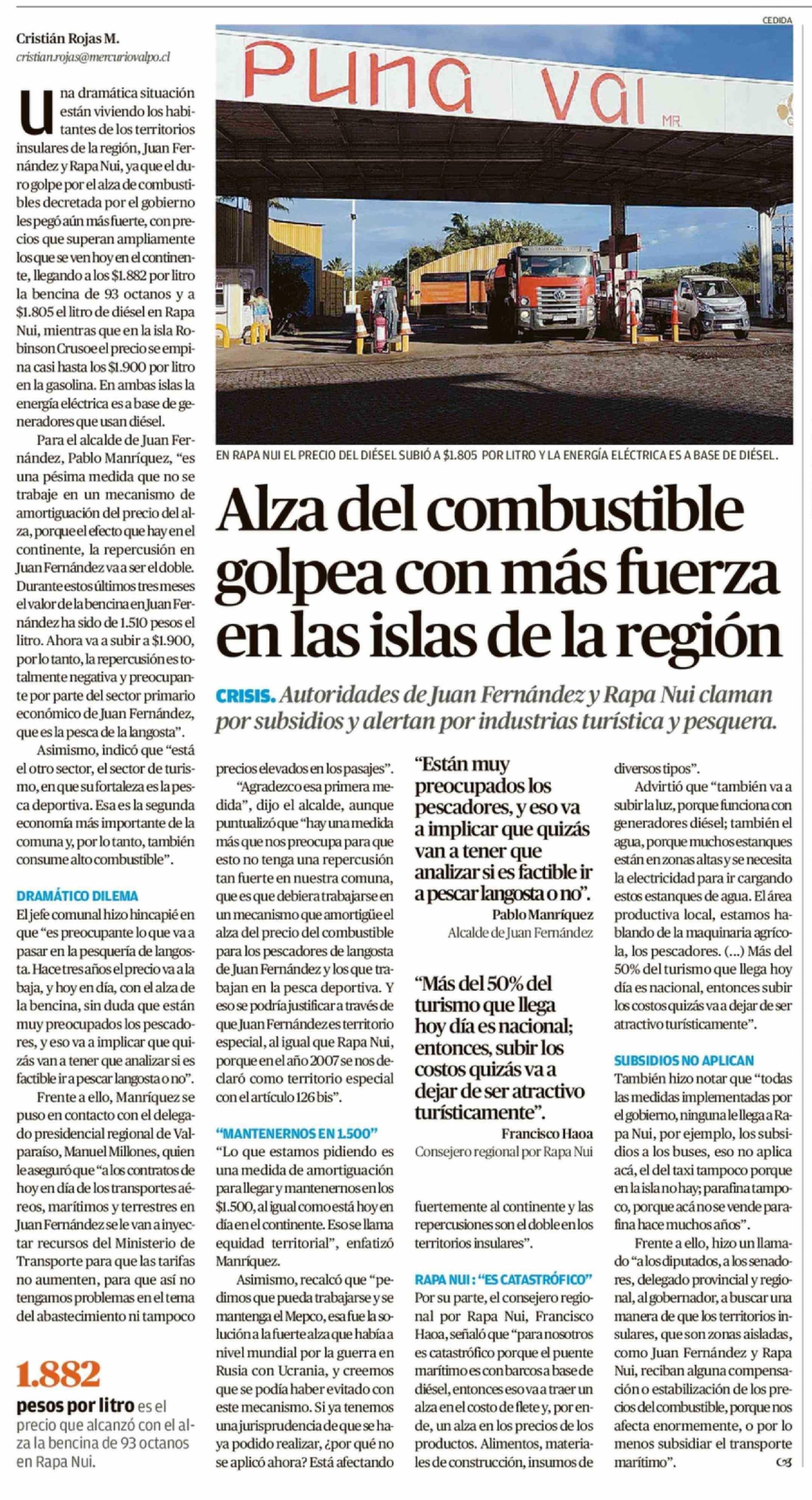 Alza del combustible golpea con más fuerza en las islas de la región 28-03-2026 El Mercurio de Valparaíso |