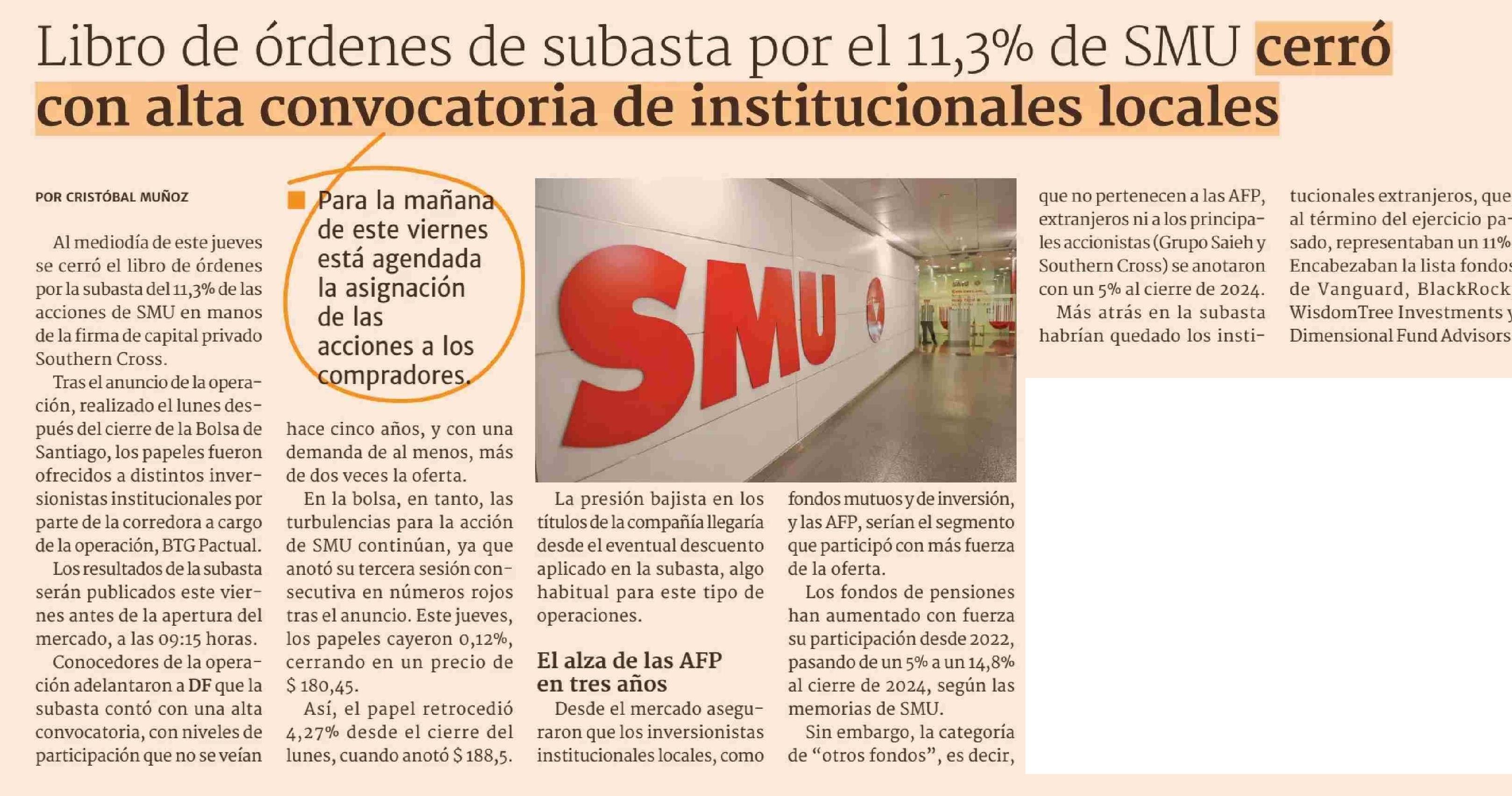 Libro de órdenes de subasta por el 11,3% de SMU cerró con alta convocatoria de institucionales locales 30-05-2025 Diario Financiero |