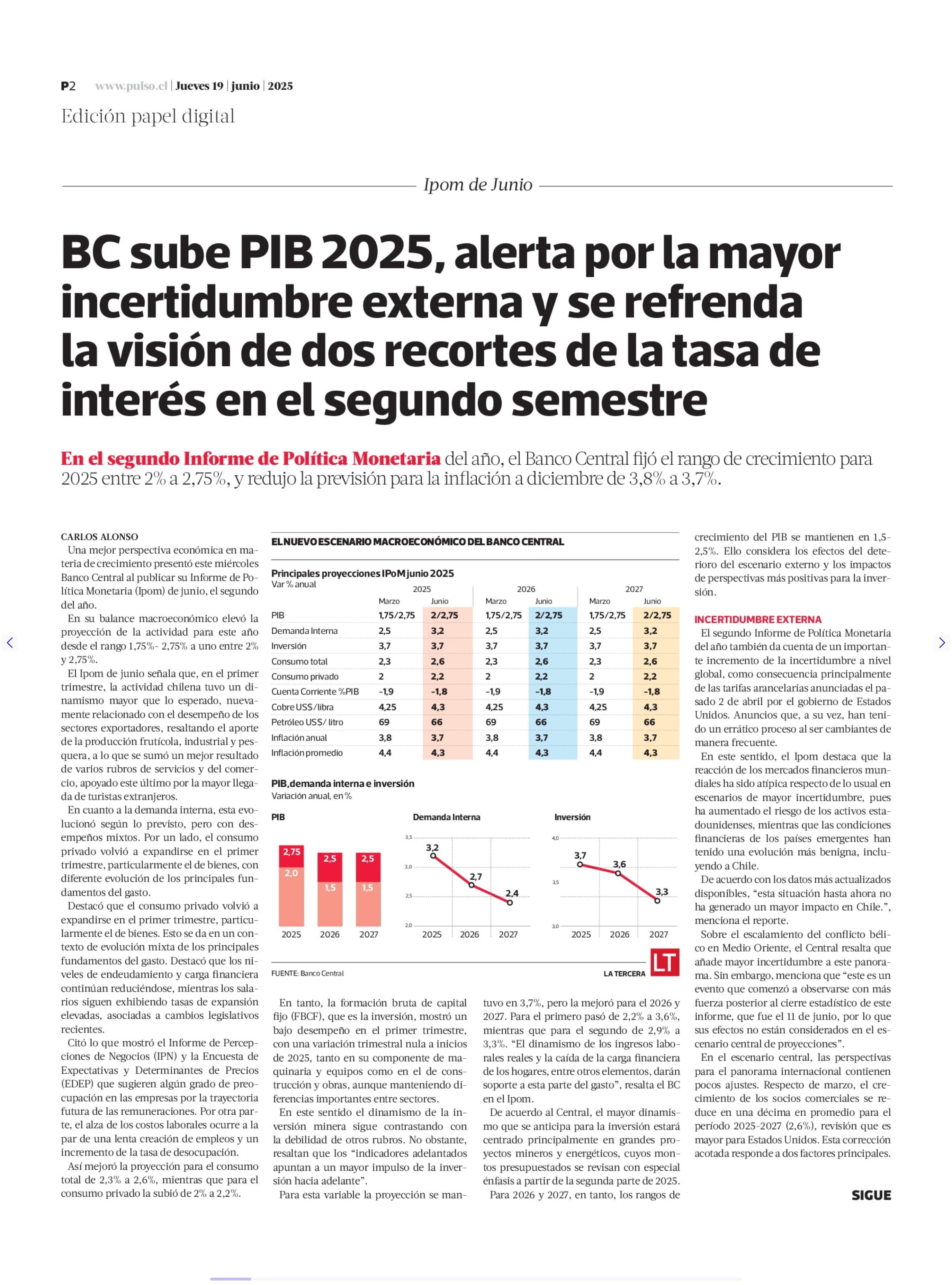 BC sube PIB 2025, alerta por la mayor incertidumbre externa y se refrenda la visión de dos recortes de la tasa de interés en el segundo semestre 19-06-2025 La Tercera |
