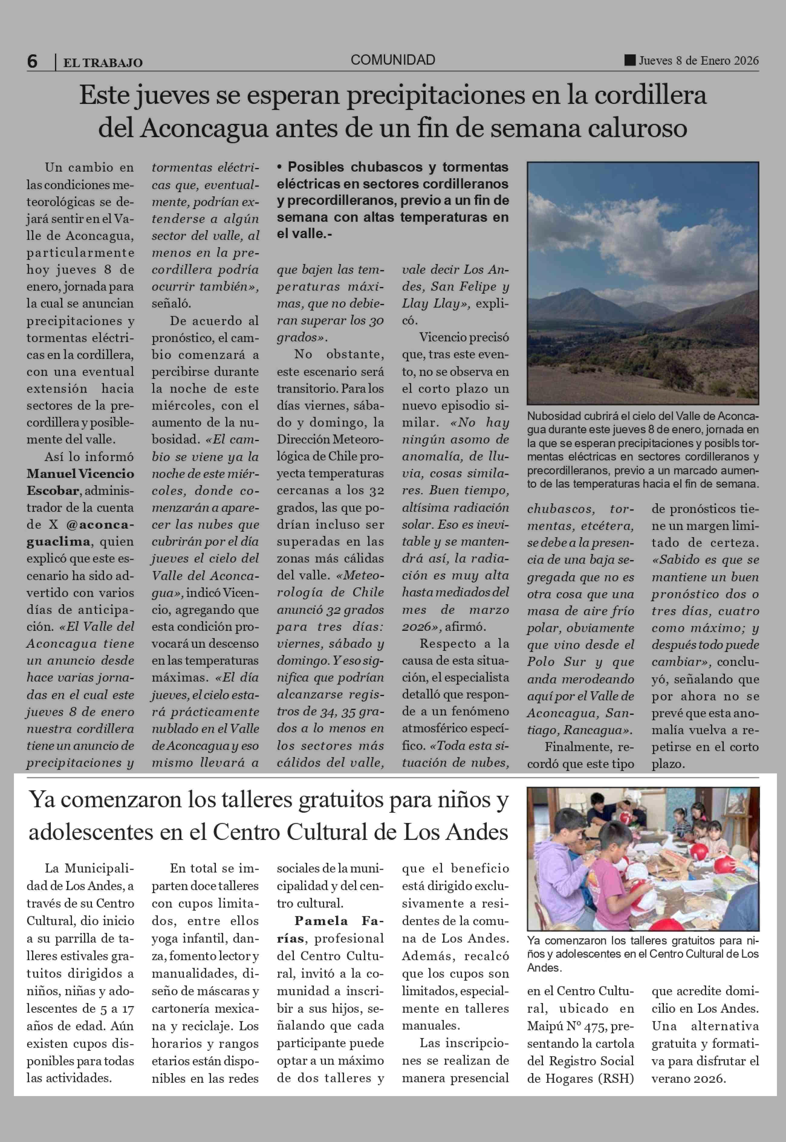 Ya comenzaron los talleres gratuitos para niños y adolescentes en el Centro Cultural de Los Andes 08-01-2026 El Trabajo |