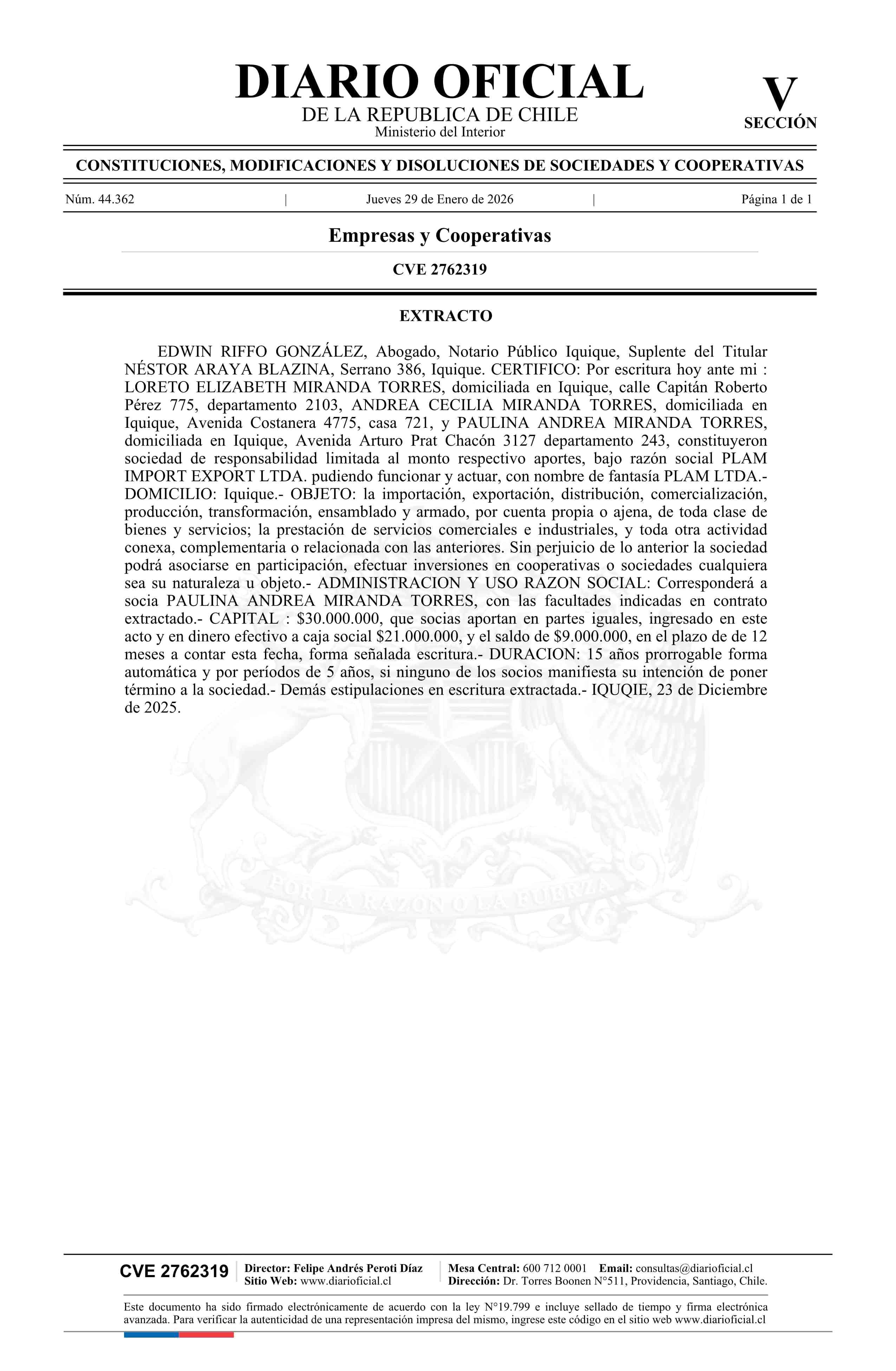 PLAM IMPORT EXPORT LTDA. 29-01-2026 Diario Oficial Edición Electrónica |