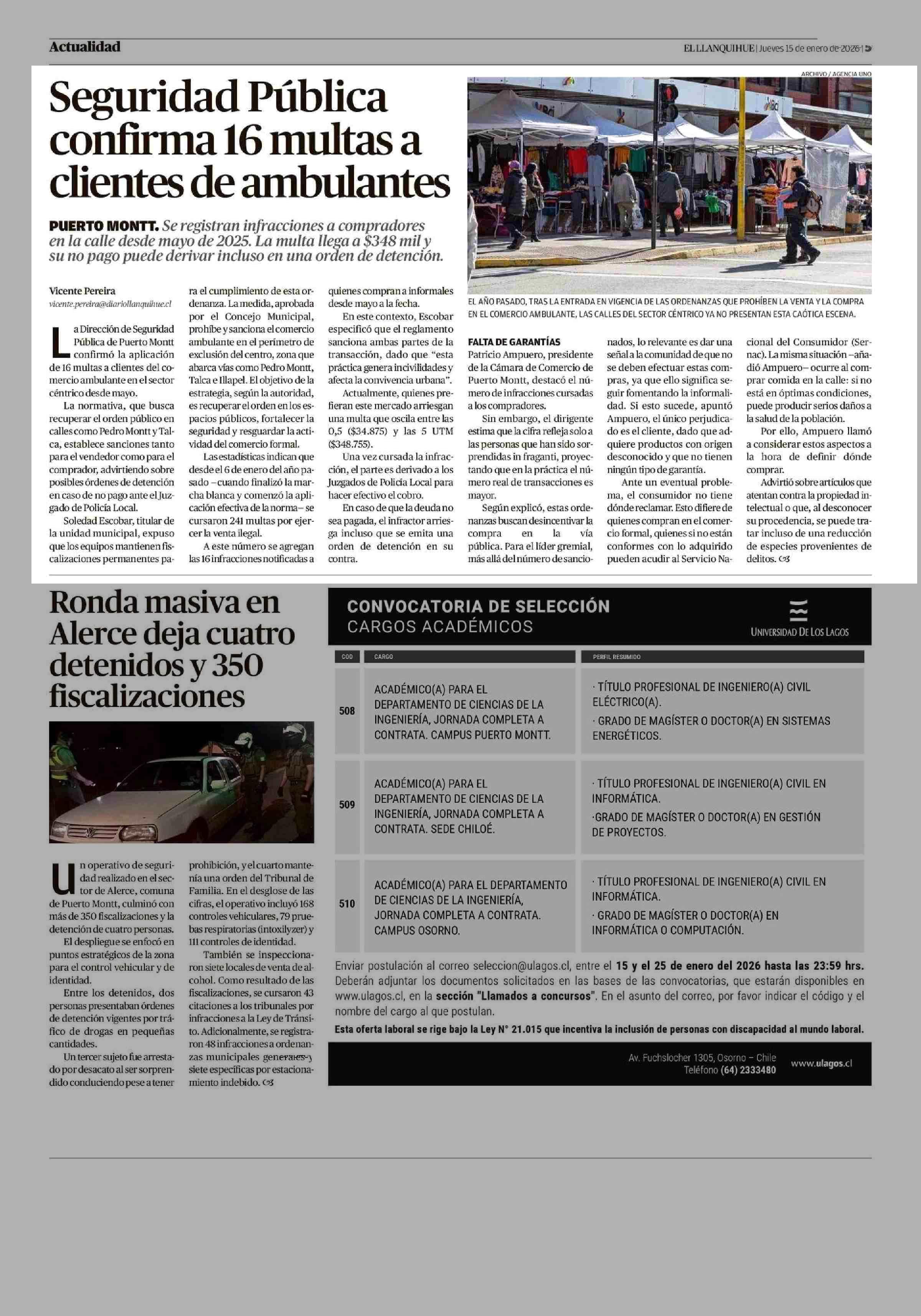 Seguridad Pública confirma 16 multas a clientes de ambulantes 15-01-2026 El Llanquihue |