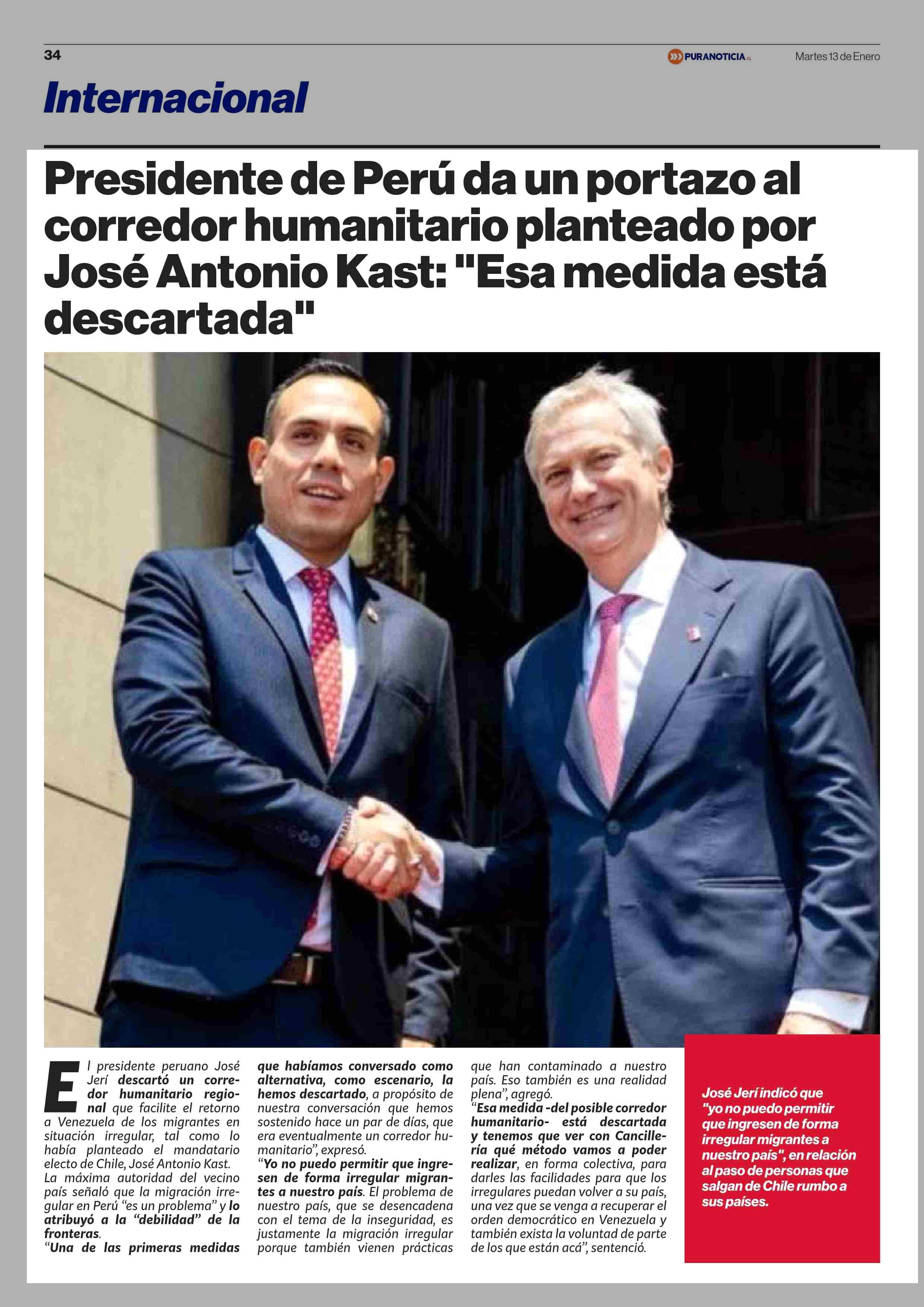 Presidente de Perú da un portazo al corredor humanitario planteado por José Antonio Kast: “Esa medida está descartada” 13-01-2026 Puranoticia.cl |