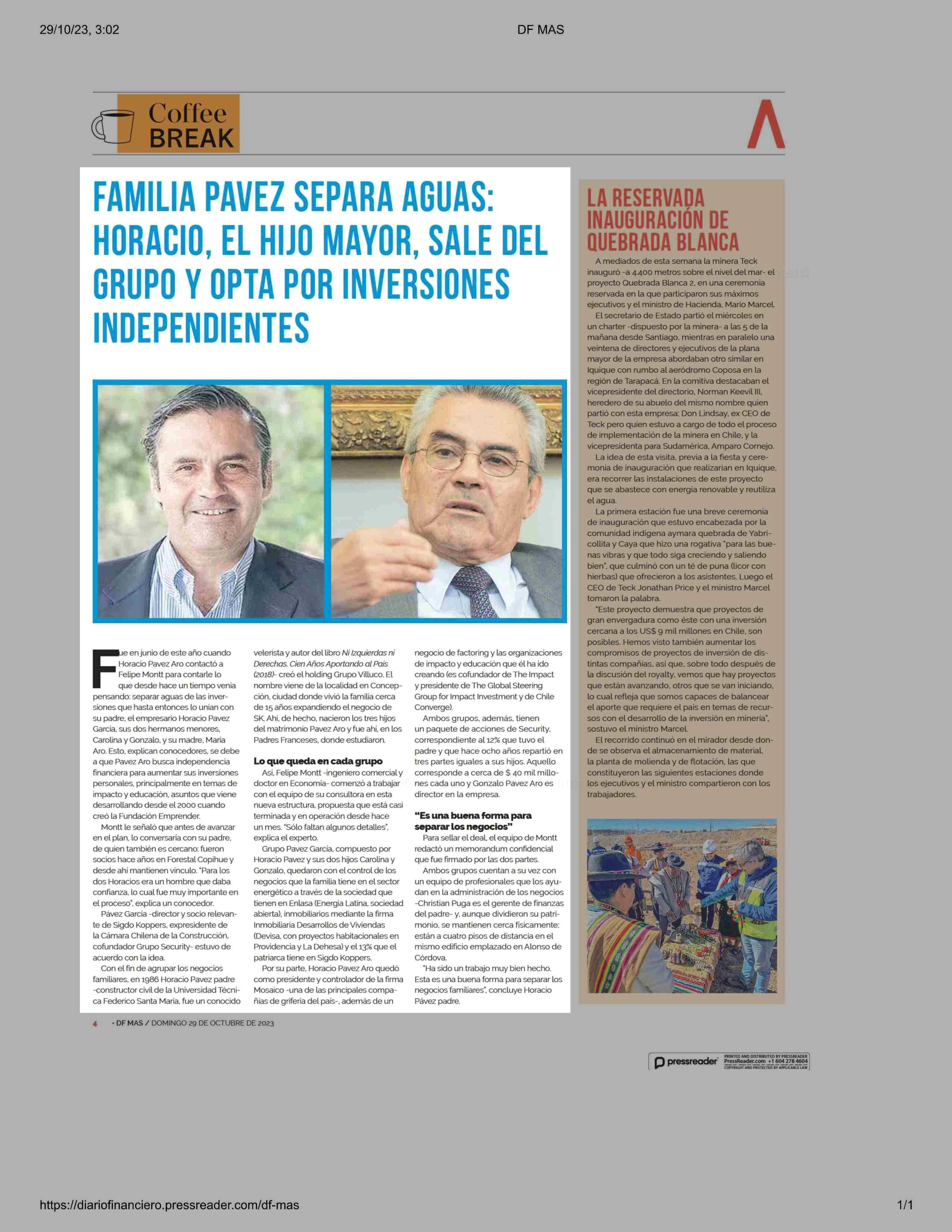 FAMILIA PAVEZ SEPARA AGUAS: HORACIO, EL HIJO MAYOR, SALE DEL GRUPO Y OPTA POR INVERSIONES INDEPENDIENTES 29-10-2023 Diario Financiero |